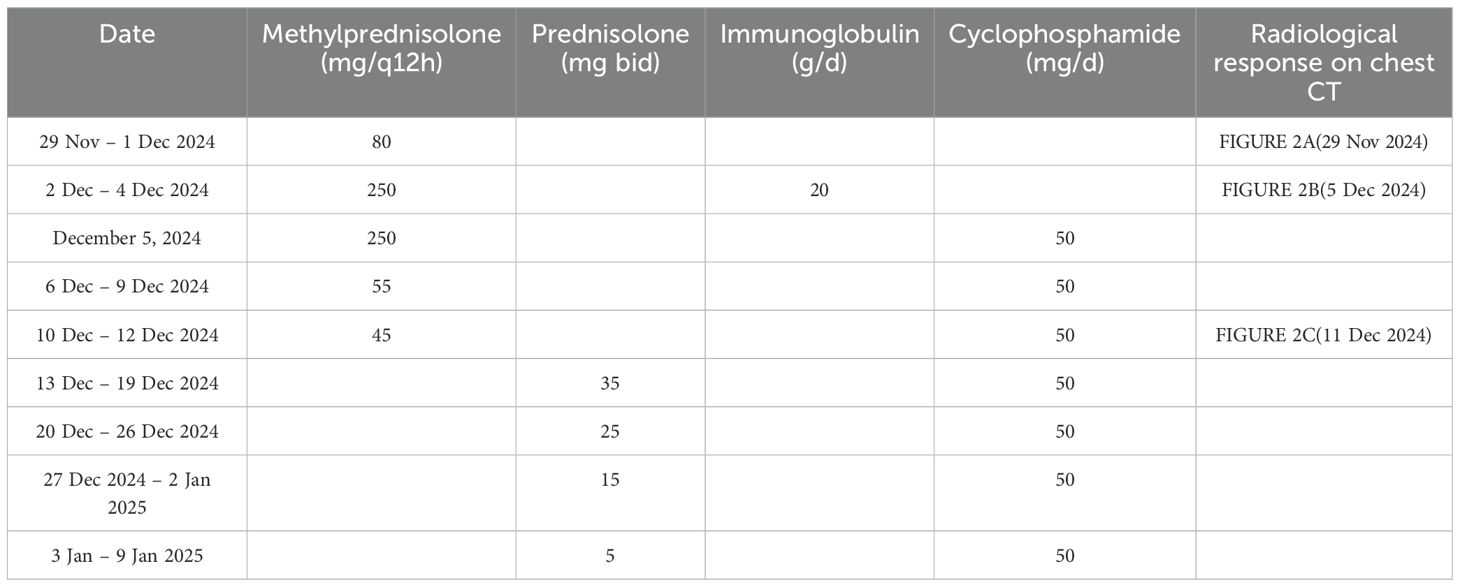 A bedside right thoracentesis was performed to drain pleural effusion, and symptoms improved slightly after intravenous infusion of 80 mg methylprednisolone. Oxygen supplementation via a non-rebreather mask at 15 L/min stabilized her SpO2 between 94% and 99%. However, despite receiving a three-day course of methylprednisolone (80 mg q12h, from November 29 to December 1, 2024) for anti-inflammatory purposes, the patient continued to experience recurrent chest tightness and decreased SpO2. Then she was referred to our department with Grade 4 ILD (Diffuse Alveolar Damage/DAD pattern on CT) and life-threatening respiratory failure (NCI-CTCAE v5.0). Accordingly, the treatment was escalated to high-dose methylprednisolone (250 mg every 12 hours for 4 days, from December 2 to December 5) and intravenous immunoglobulin (20g daily for 3 days, totaling 1g/kg, from December 2 to December 4). To manage the left pleural effusion, a therapeutic thoracentesis was performed. Following three days of high-dose glucocorticoid and intravenous immunoglobulin pulse therapy, the patient maintained stable peripheral oxygen saturation (100%) on 10 L/min non-rebreather mask. However, repeat chest CT (5 December 2024, Figure 2B) demonstrated diffuse patchy opacities in both lungs with heterogeneous attenuation and ill-defined margins. Comparative assessment revealed partial resolution in the right middle lobe and left lung, but mild progression in the right upper lobe. Methylprednisolone was tapered to 55 mg q12h, and low-dose cyclophosphamide (50 mg qd) was added. Following six days of low-dose cyclophosphamide combination therapy, the patient demonstrated marked symptomatic improvement with resolution of chest tightness, maintained SpO2 of 100% on 4 L/min nasal cannula, and improved mobility in bed. A repeat chest CT (11 December 2024, Figure 2C) revealed bilateral diffuse patchy opacities with heterogeneous density and ill-defined margins, which had significantly decreased in size compared to prior imaging. Methylprednisolone was further reduced to 45 mg q12h. On December 13, the patient began oral prednisone with a slow dose reduction. She was discharged on December 16 with stable vital signs and instructions for outpatient follow-up. Following discharge, the patient continued oral cyclophosphamide at a constant dose and prednisone (with a slow tapering regimen starting at 35 mg twice daily and reduced by 20 mg per week) until both medications were discontinued on January 10, 2025, but declined serial complete blood count monitoring and prophylactic trimethoprim-sulfamethoxazole (TMP-SMX) for Pneumocystis jirovecii pneumonia (PJP) prevention. At 30-day follow-up, she maintained an oxygen saturation of 100% on 2 L/min nasal cannula; however, she exhibited marked cachexia, suggesting possible progression of her underlying malignancy. The specifics of the treatment protocol, including dosage and duration, are summarized in Table 3.