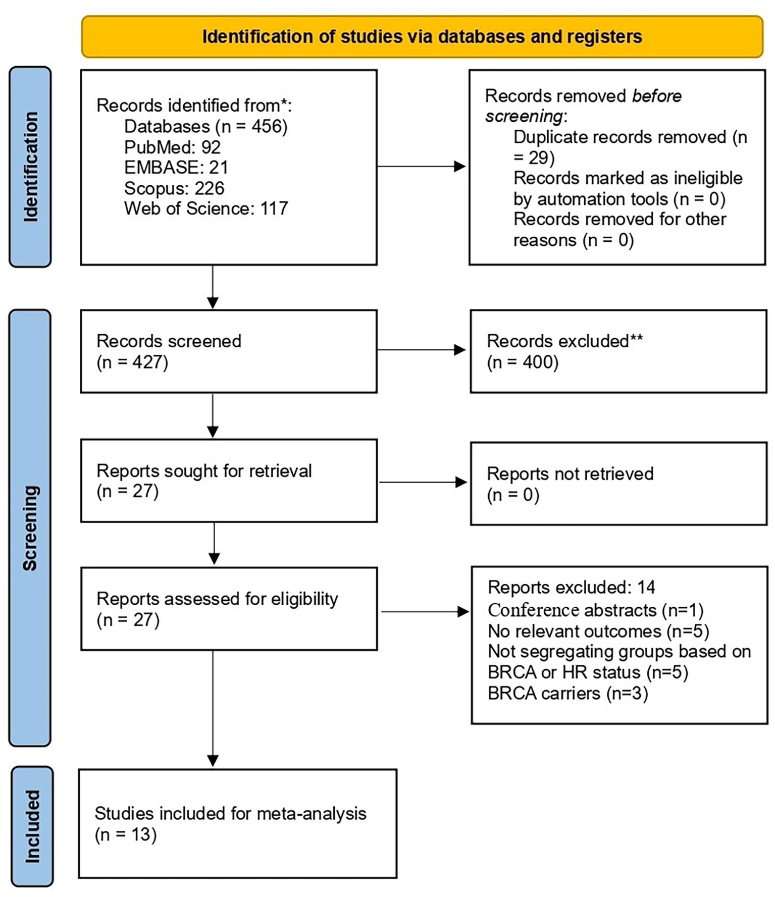The initial search retrieved 456 records. After removing the duplicates, 427 underwent title and abstract screening. Subsequently, full-text evaluation of eligibility was carried out for 27 articles. Finally, thirteen articles (24–36) were included (Figure 1).