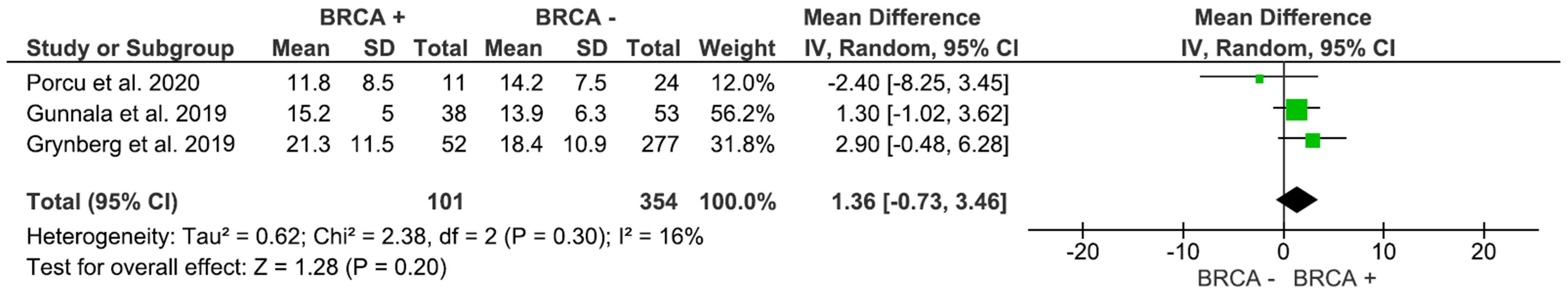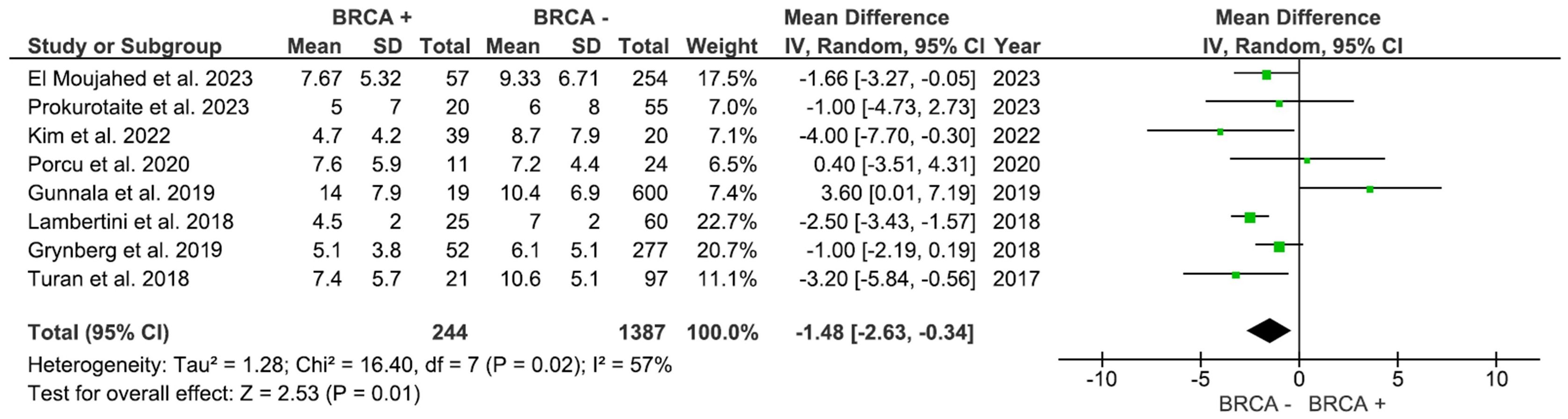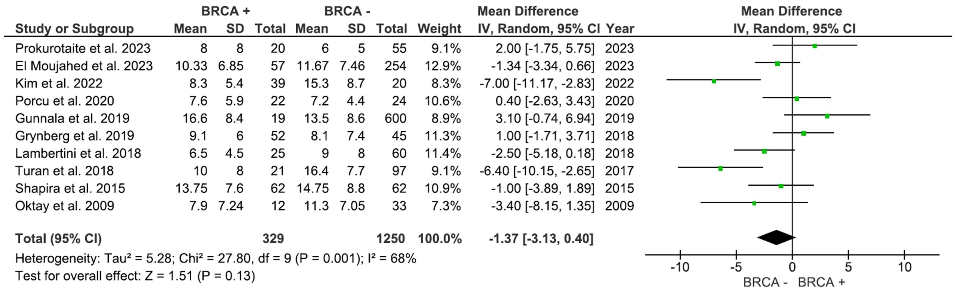 A total of 10 studies with 1,579 participants compared the number of retrieved oocytes in women with and without BRCA mutations (Figure 2). The pooled analysis showed no statistically significance (p=0.13), with an MD of -1.37 (95% CI: -3.13 to 0.40), in the number of oocytes in the Non-BRCA group (I2 = 68%).