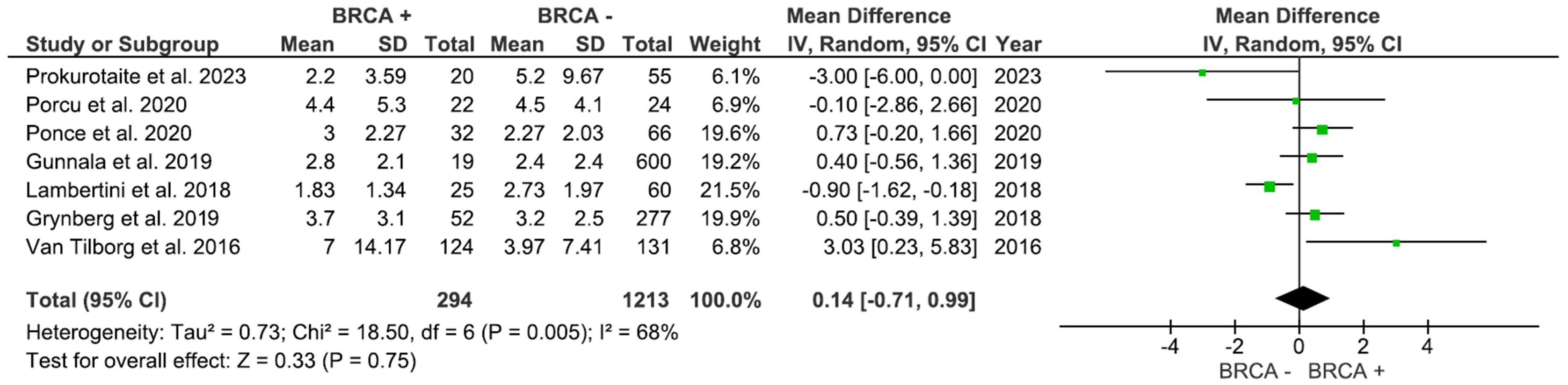 AFC, assessed in 3 studies with 455 participants, was higher in individuals with BRCA mutations compared to patients with no mutations (Figure 4); however, the result was not significant (MD: 1.36, 95% CI: -0.73 to 3.46), p=0.20 (I2 = 16%). As shown in Figure 5, AMH levels, pooled from 7 studies including 1,507 participants, was not significantly different between BRCA and non-BRCA BC patients (MD: 0.14, 95% CI: -0.71 to 0.99), p=0.75 (I2 = 68%).