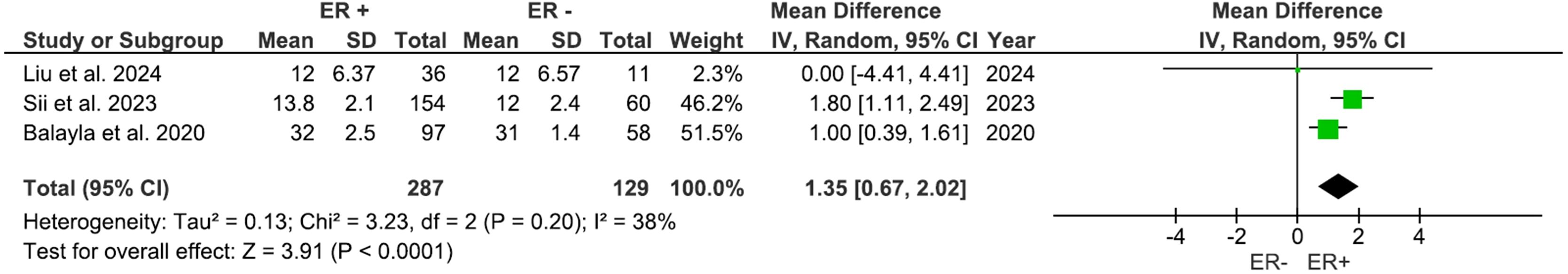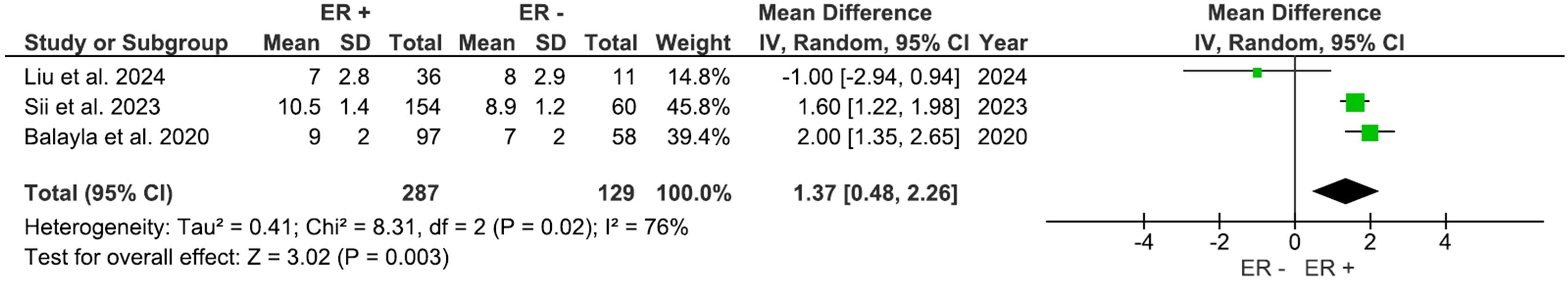 Three studies, including 416 participants, evaluated outcomes based on the ER status. AFC was significantly higher (Figure 6) in the ER-positive group compared to other groups, with a mean difference of 1.37 (95% CI: 0.48 to 2.26), p=0.003 (I2 = 76%). The number of retrieved oocytes was also considerably higher in the ER-positive group (Figure 7), with a mean difference of 1.35 (95% CI: 0.67 to 2.02), p<0.0001 (I2 = 38%).