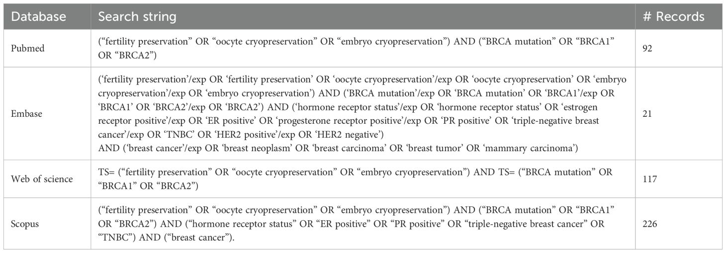 Digital searches were conducted across PubMed, Embase, Web of Science, and Scopus databases for studies published up to March 31, 2025. The following search string was developed and applied, using keywords and Medical Subject Headings (MeSH): (“fertility preservation” OR “oocyte cryopreservation” OR “embryo cryopreservation”) AND (“BRCA mutation” OR “BRCA1” OR “BRCA2”) AND (“hormone receptor status” OR “ER positive” OR “PR positive” OR “triple-negative breast cancer” OR “TNBC”) AND (“breast cancer”). The search strategies for individual databases are provided in Table 1. Additionally, reference lists of eligible studies were reviewed manually to ensure no relevant articles were overlooked.