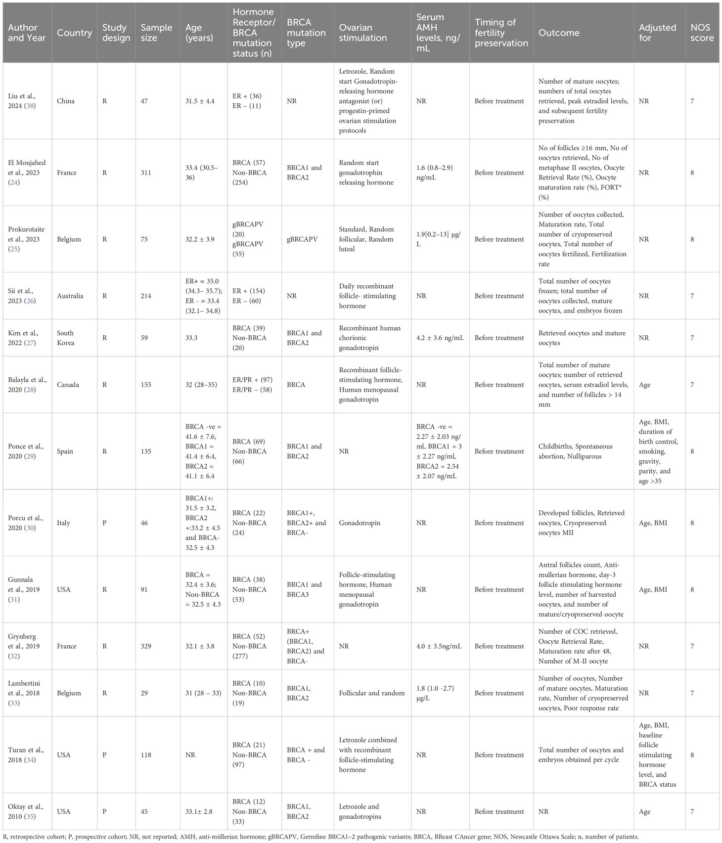 A total of thirteen studies published between 2010 and 2024 were included, comprising both retrospective (n=10) and prospective (n=3) cohort designs, with sample sizes ranging from 29 to 329 participants. The total sample size of all studies was 1,654. The majority of studies were conducted in Europe and North America, with few studies from Asia and Australia. The mean age of participants was approximately 31–35 years across studies. Majority studies evaluated women with BC carrying BRCA1/2 mutations and only three studies stratified patients based on ER status. Fertility preservation was consistently performed prior to initiation of systemic therapy in all studies. The ovarian stimulation protocols varied among studies. Random-start gonadotropin-releasing hormone (GnRH) was the most frequently used stimulation protocol (24, 36, 37). Letrozole combined with GnRH antagonists was also commonly employed (34, 35, 38). Recombinant follicle-stimulating hormone (FSH) with or without human menopausal gonadotropin (hMG), was widely used (26, 28, 31). The outcomes reported by the studies also showed wide variation. The NOS quality scores ranged from 7 to 8, indicating generally moderate-to-high methodological quality. Table 2 provides the characteristics and quality of the individual studies.