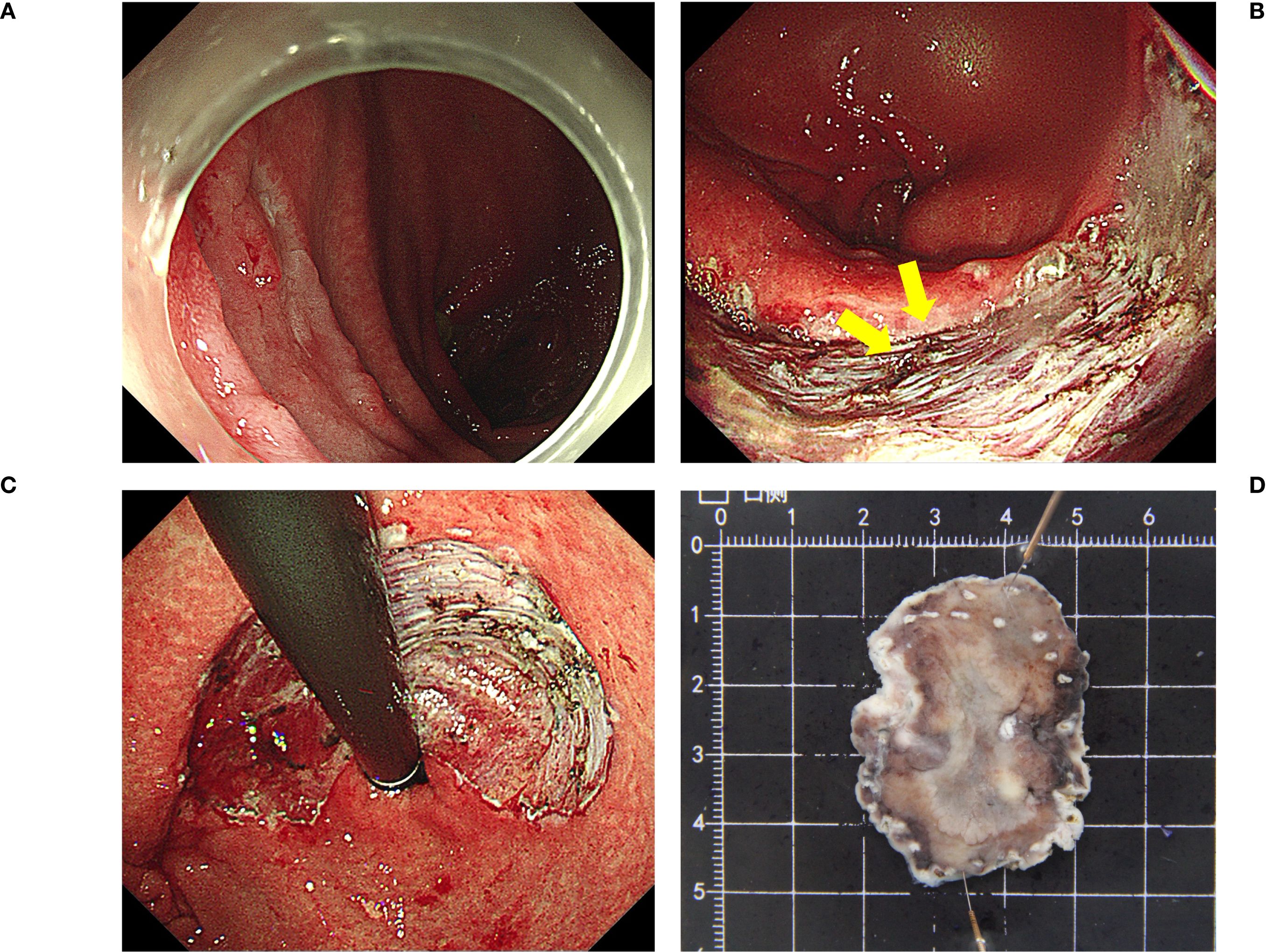 Figure 1. The ESD procedure (A) A remnant gastric tumor confirmed at the posterior part of the stomach body; (B) Surgical staples (yellow arrows). (C, D) En bloc resection. Pathological results: tub1>tub2, type 0-IIa, 3.3×2.3 cm, M, ly0, V0, UL0, HM0, VM0. ESD, endoscopic submucosal dissection.