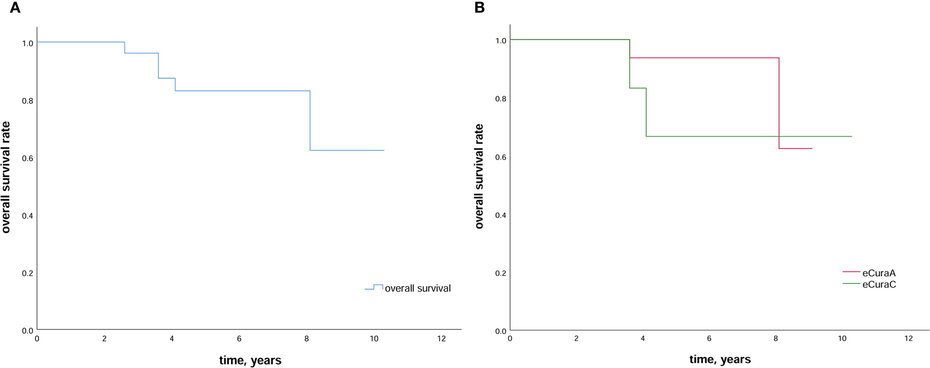Figure 2. Survival outcomes after ESD (A) Kaplan–Meier estimation of survival in patients who undergo ESD in a remnant stomach or a gastric conduit. The 5-year overall survival is 83.0%; (B) Kaplan–Meier curve comparing the 5-year overall survival rate in patients with RGC subjected to eCuraA and eCuraC resection. ESD, endoscopic submucosal dissection; RGC, remnant gastric cancer.