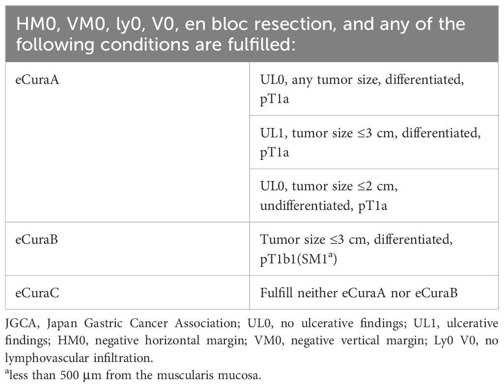 Absolute indication: (1) differentiated-type intramucosal cancer (T1a) without ulcerative findings (UL0); (2) differentiated-type intramucosal cancer (T1a) with ulcerative findings (UL1), and the diameter is ≤3 cm; and (3) undifferentiated-type intramucosal cancer (T1a) without ulcerative findings (UL0), and the diameter is ≤2 cm.