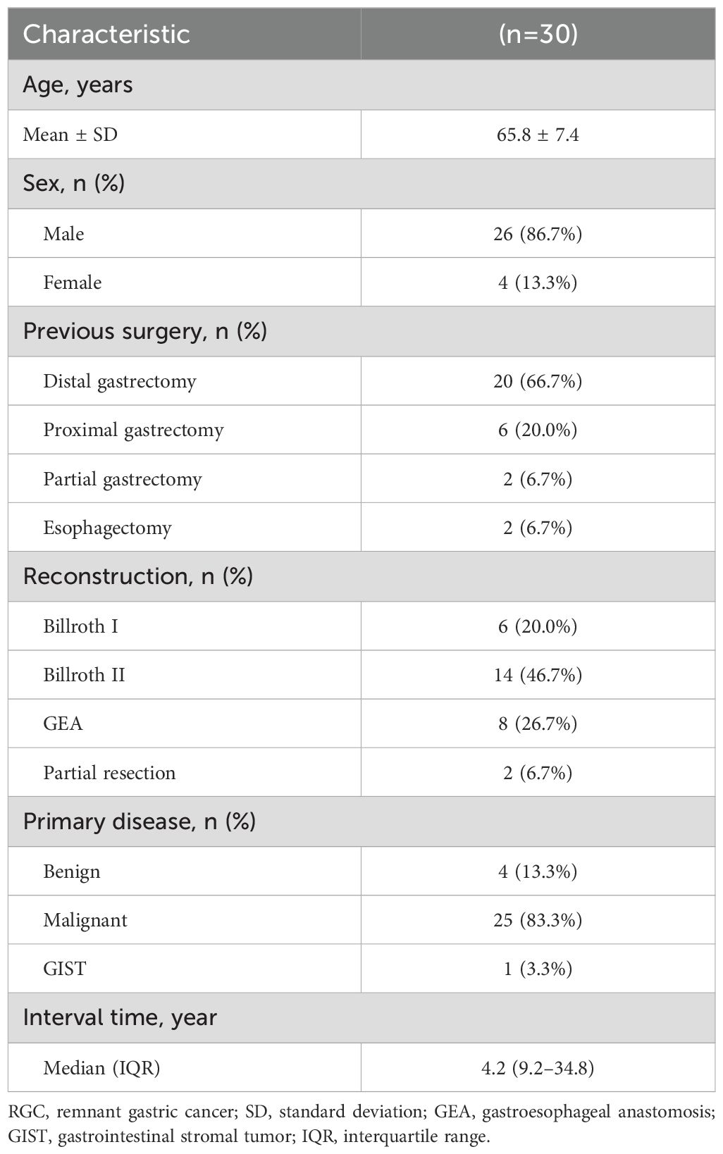 Table 2 summarizes the clinicopathological characteristics of the 30 patients (mean age: 65.8±7.4 years) included in the study. Most were male patients (26/30, 86.7%). The median interval from the initial surgery to the detection of remnant gastric lesions was 4.2 (IQR: 9.2–34.8) years. Previous surgeries included distal gastrectomy (n=20, 66.7%), proximal gastrectomy (n=6, 20.0%), partial gastrectomy (n=2, 6.7%), and esophagectomy with a gastric conduit (n=2, 6.7%). Distal gastrectomy with Billroth II reconstruction was the primary type of surgery performed (14/30, 46.7%). While 25 (83.3%) patients had malignant tumors as the primary disease, 4 (13.3%) had benign tumors, and 1 (3.3%) had a gastrointestinal stromal tumor.
