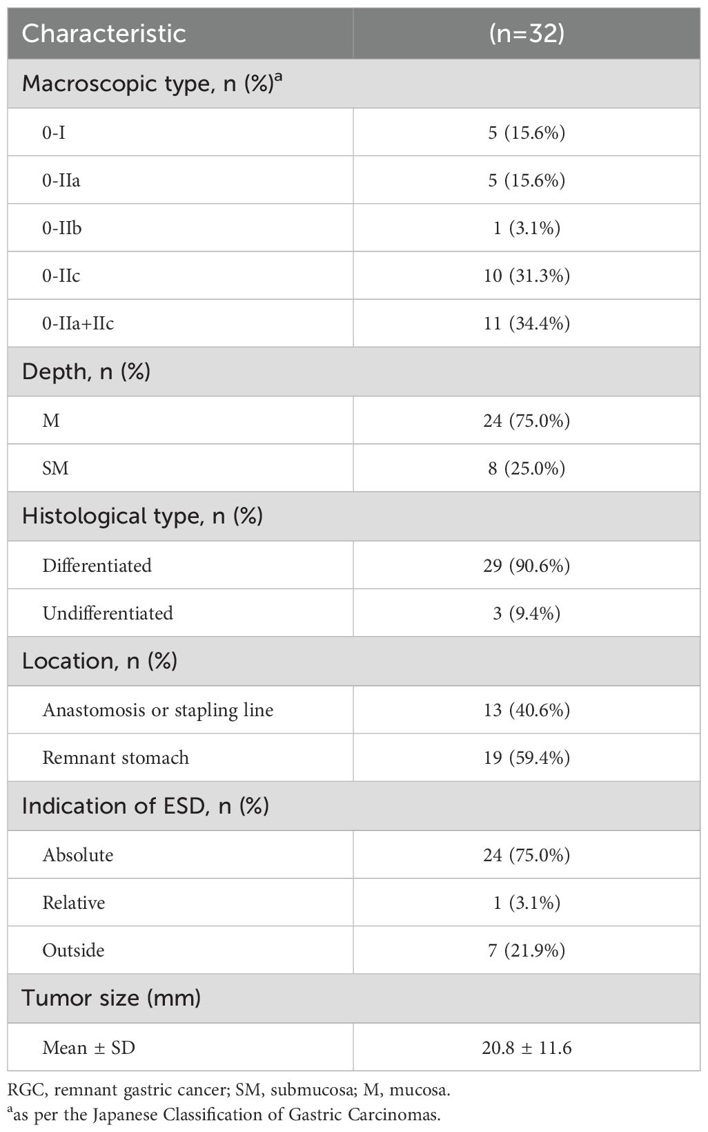 Methods: This retrospective study examined the clinicopathological characteristics and clinical outcomes in 30 patients (32 lesions) with remnant gastric cancer who underwent endoscopic submucosal dissection from 2012 to 2023 at the Endoscopy Center of Peking University Cancer Hospital, China.