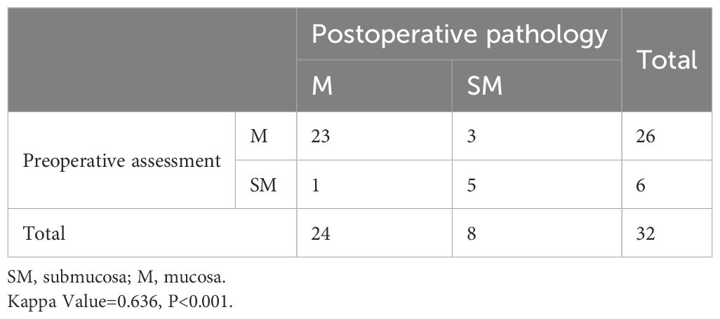 The clinicopathological characteristics of the 32 RGC lesions are presented in Table 3. The mean lesion size was 20.8 ± 11.6 mm. Macroscopically, most lesions were type 0–II (27/32, 84.4%), and histologically, most were differentiated (29/32, 90.6%). While 24 (75.0%) lesions were limited to the mucosa, 8 (25.0%) showed submucosal invasion. The indications for ESD were absolute in 24 (75.0%) lesions, relative in 1 (3.1%), and external in 7 (21.9%). Thirteen (40.6%) lesions were located at the anastomosis site or linear stapling line. The agreement analysis of preoperative invasion depth assessment and postoperative pathology for 32 lesions is shown in Table 4. While 28 lesions (87.5%) were consistent, there were 4 inconsistent cases, of which 3 had preoperative diagnoses indicating lesions limited to the mucosa (M) and postoperative pathology confirmed involvement of the submucosa (SM), and one lesion with a preoperative diagnosis of M was found to be SM postoperatively. The Kappa coefficient was 0.636, with a P-value of <0.001.