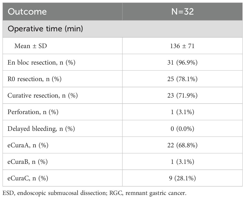 The mean operation time for ESD was 136 ± 71 min. The en bloc resection rate was 96.9%, and only one lesion, which was present in the submucosa, was unresectable. The R0 and curative resection rates were 78.1% and 71.9%, respectively. The perforation rate was 3.1%, with one case of perforation during the operation. There were no cases of delayed bleeding post-resection. eCuraA was achieved in 22 (68.8%) lesions, eCuraB in 1 (3.1%), and eCuraC in 9 (28.1%). Table 5 summarizes the outcomes and complications of ESD for RGC.