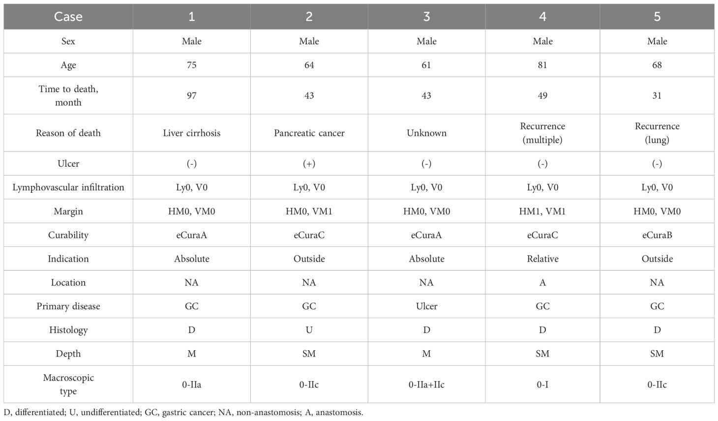 Detailed information on the five deaths is presented in Table 6. Of the two patients who died from GC, one had a relative indication for ESD, and liver metastases were discovered during the initial GC. After gastrectomy for the primary gastric cancer (PGC), the patient underwent radiofrequency ablation and transarterial chemoembolization (TACE) several times for the liver lesions. The RGC lesion developed during TACE, and the patient was treated when the liver metastatic lesions had stabilized. However, the postoperative horizontal and vertical margins were both pathologically positive, and local recurrence was seen 10 months post-ESD. The patient died of multiple metastases from GC 49 months post-ESD. Another patient who died from GC had absolute indications, achieved curative resection with ESD, and died of lung metastases from GC in postoperative month 31.