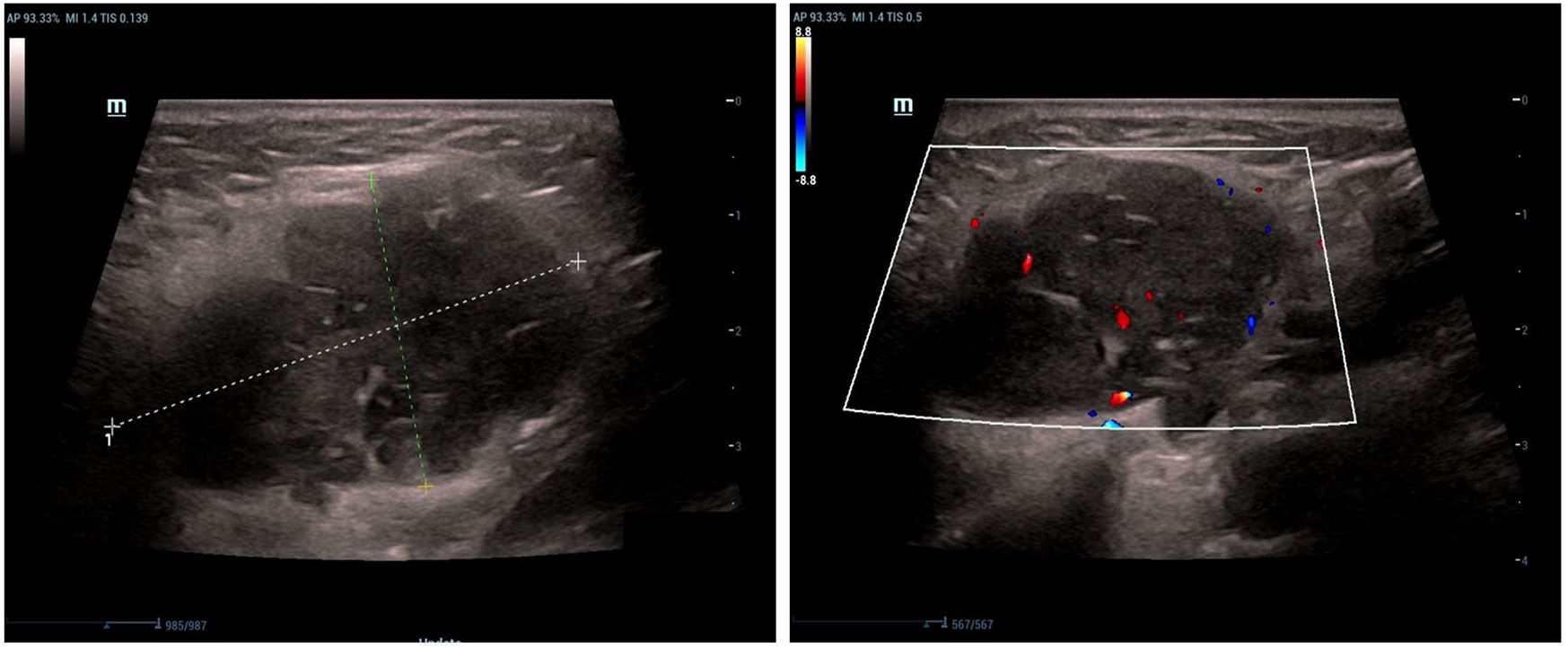 The left parotid gland demonstrated a hypoechoic lesion measuring approximately 4.5 × 3.9 × 2.3 cm. This lesion exhibited circumscribed margins, an irregular contour, and heterogeneous internal echogenicity, with a distinct hyperechoic linear band visualized within it. Color Doppler Flow Imaging (CDFI) revealed strip-like vascularity within the lesion. Additionally, multiple lymph nodes were observed within and surrounding the left parotid parenchyma. The largest lymph node measured approximately 2.9 × 2.3 × 2.1 cm, with discernible borders but an indistinct corticomedullary differentiation. CDFI showed sparse intranodal vascularity (Figure 1).