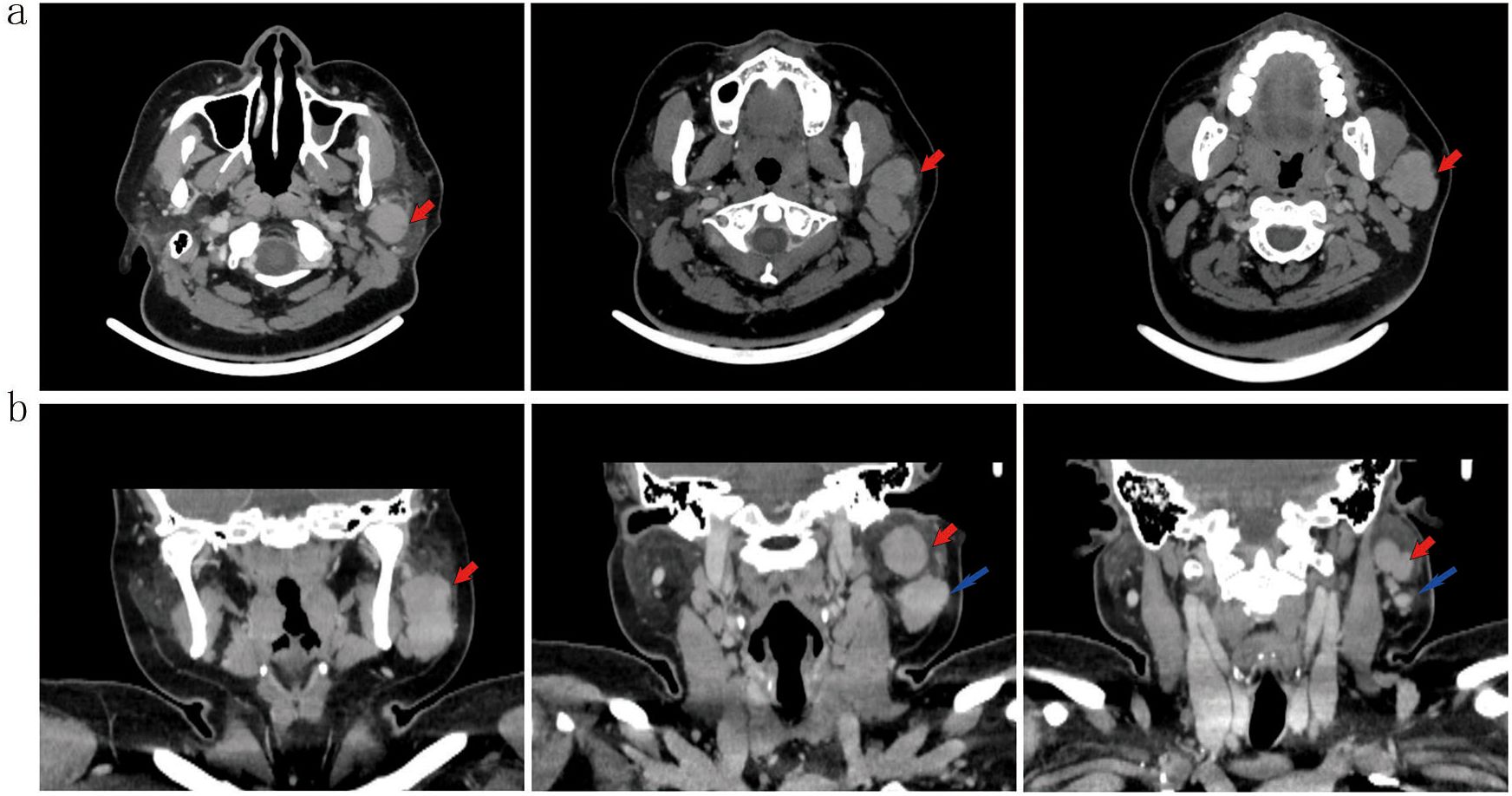 Figure 2. Axial (a) and coronal (b) contrast-enhanced CT(2.5 mm slice; IV iohexol 100 mL) shows a well-defined, lobulated soft-tissue lesion (red arrows; 3.6 × 3.0 × 4.1 cm) with moderate enhancement (~85 HU) in the left parotid gland. An adjacent lymph node is noted (blue arrow).