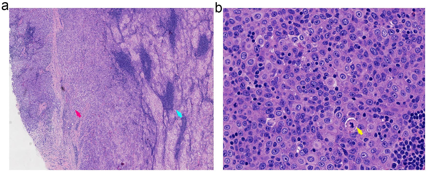 Microscopic images showing tissue samples. Panel (a) displays a wider view with marked dark areas and a red and blue arrow indicating specific regions. Panel (b) shows a close-up with densely packed cells, highlighted by a yellow arrow indicating a particular cell structure. Both images exhibit purple staining used for cell visualization.