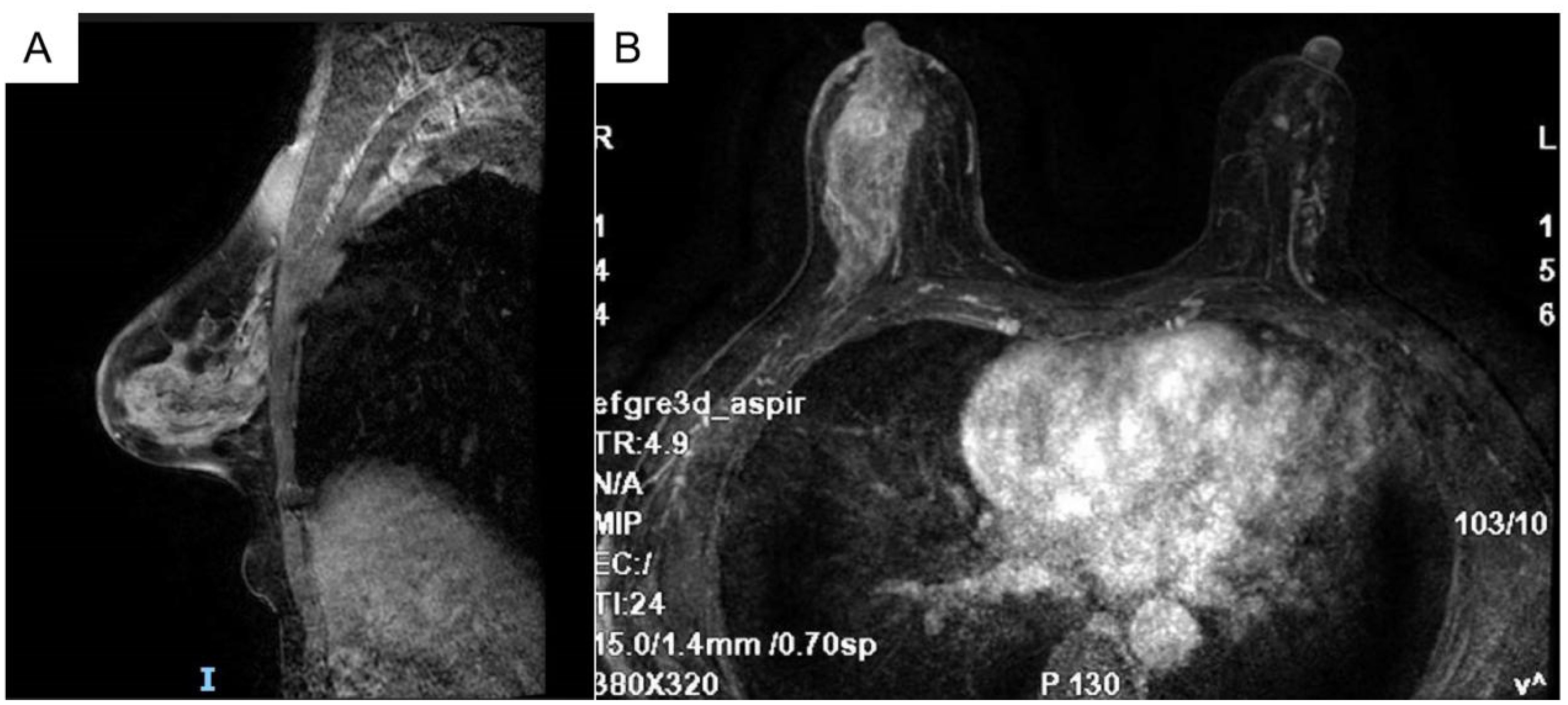 Figure 1. Bilateral breast c-shaped images with low background enhancement and multiple regional abnormal enhancement areas in the right lateral quadrant of the breast [(A) Sagittal section (B) Transverse section].