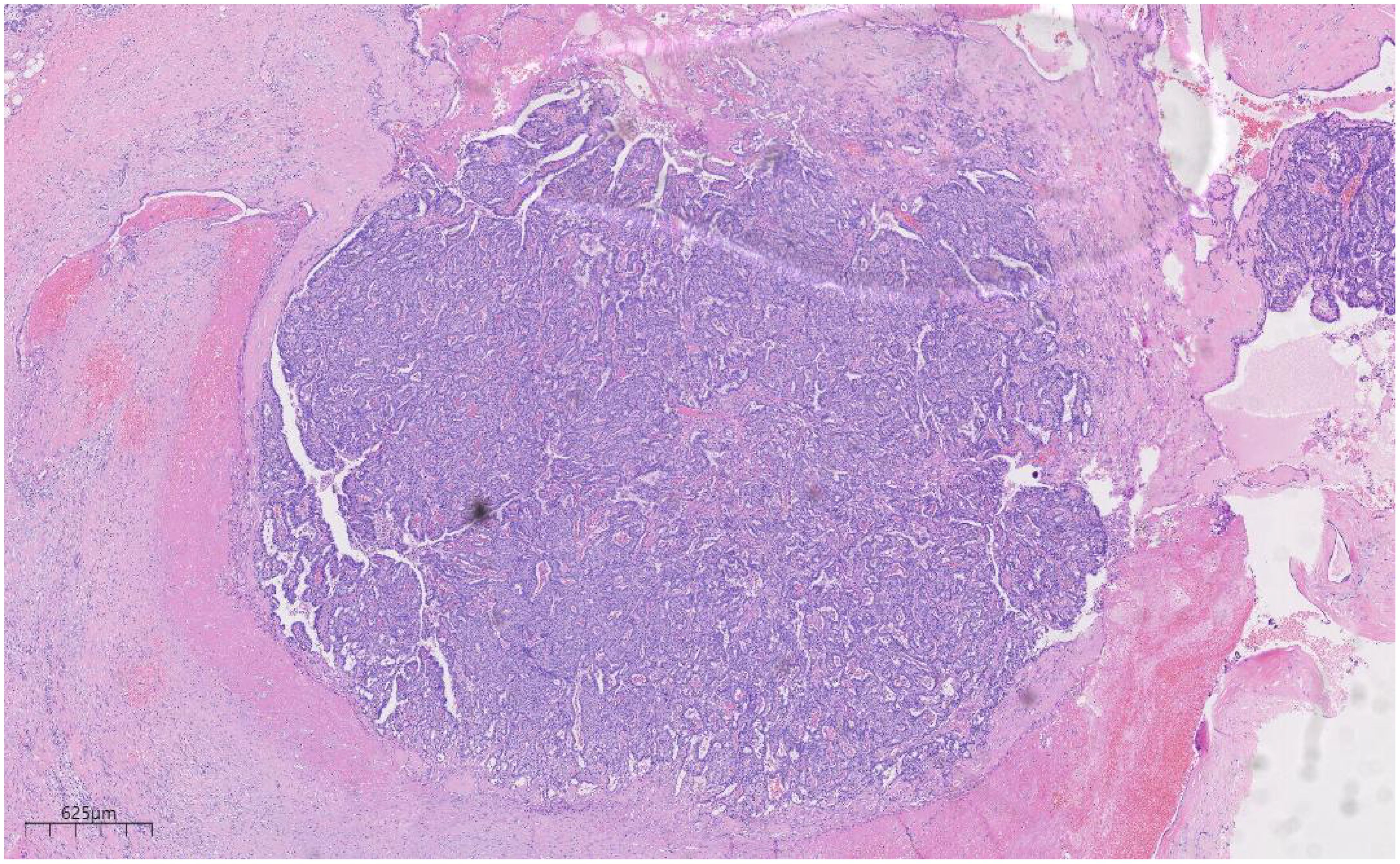 Figure 2. Low magnification shows papillary hyperplasia in the breast duct with clear margins. H&E ×15.7.