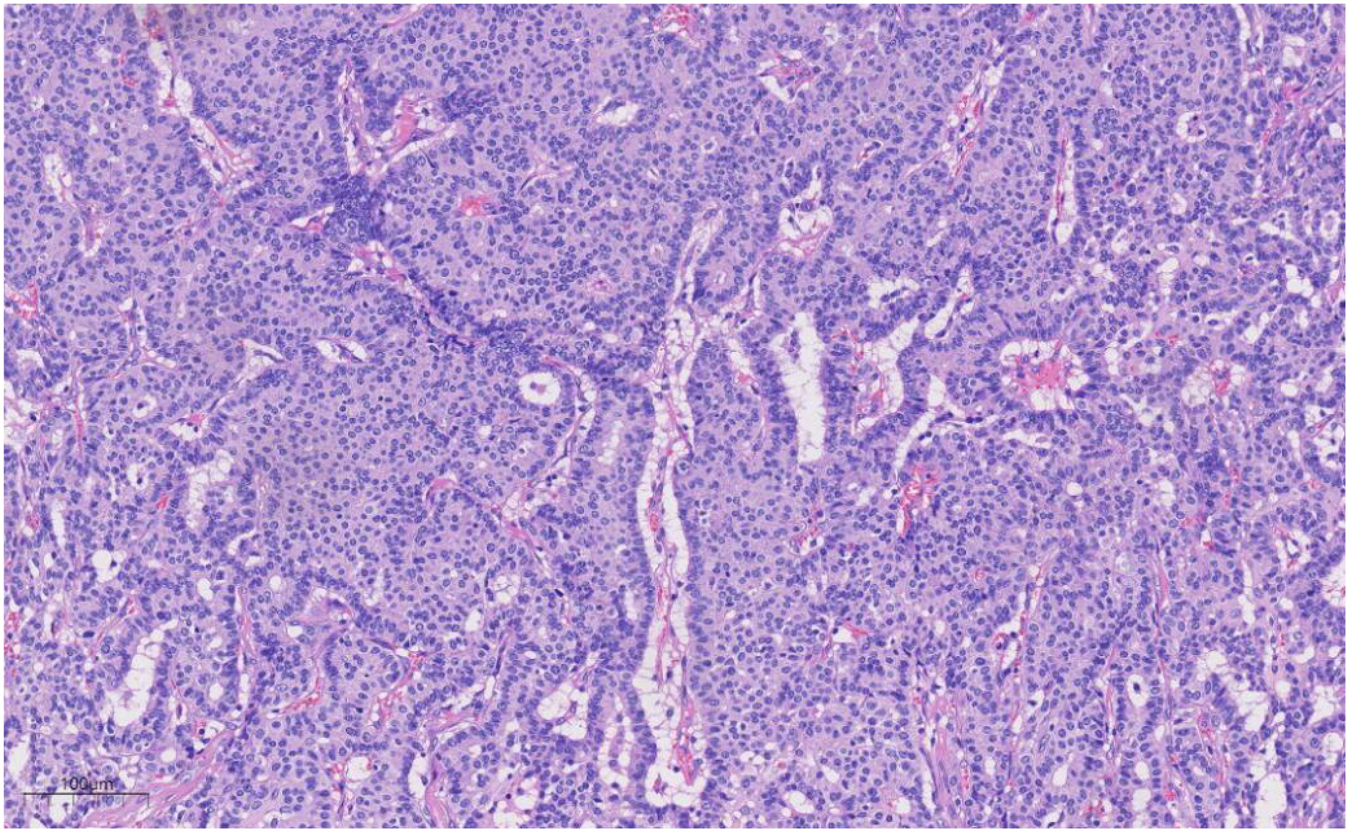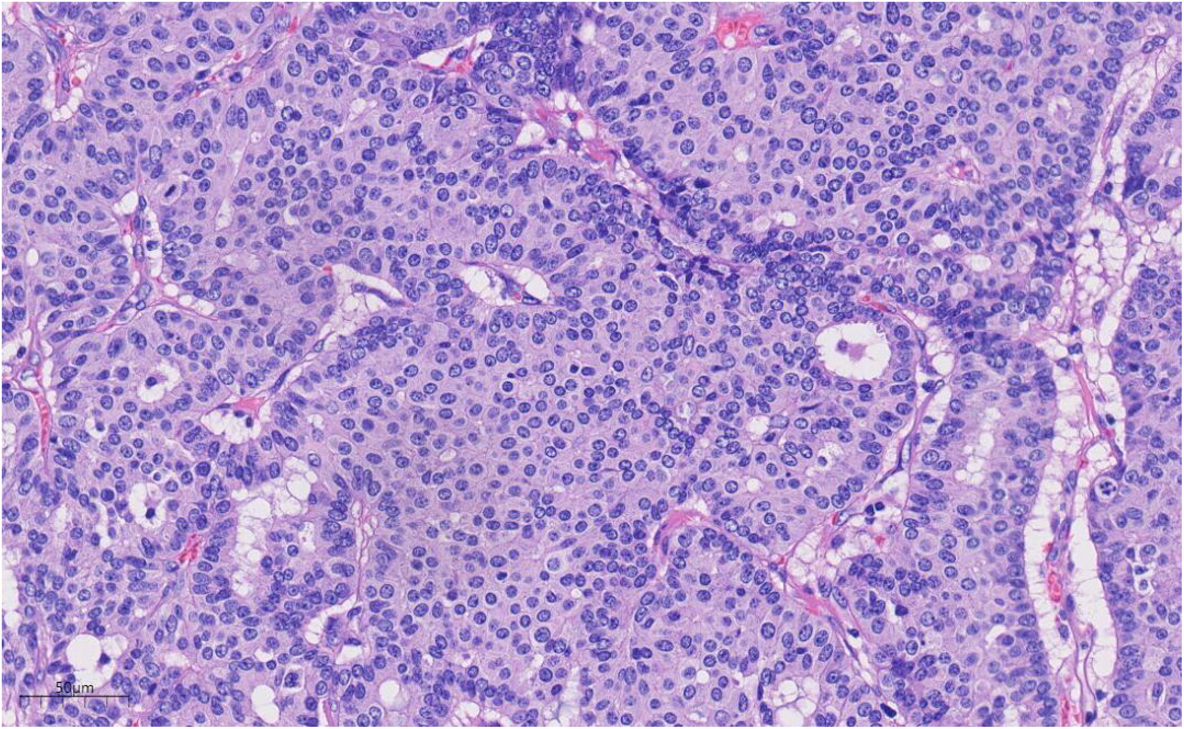 Subsequently, the patient underwent a right unilateral mastectomy, with tissue samples sent for histopathological evaluation. Gross examination revealed a single specimen with a fusiform skin flap measuring 190 mm × 130 mm × 25 mm; the skin flap itself was 130 mm × 75 mm, and the nipple diameter was 13 mm. No nipple retraction or orange peel-like changes were noted. A 50 mm incision was positioned at the 9 o’clock axis, 5 mm from the nipple. Beneath this incision, an 8 mm-deep cavity was observed, measuring 40 mm × 40 mm × 10 mm, with no discernible induration or irregularities within the cavity. Microscopic examination revealed multilayered ductal epithelial proliferation, marked by cellular pleomorphism, structural disorganization, and loss of polarity.