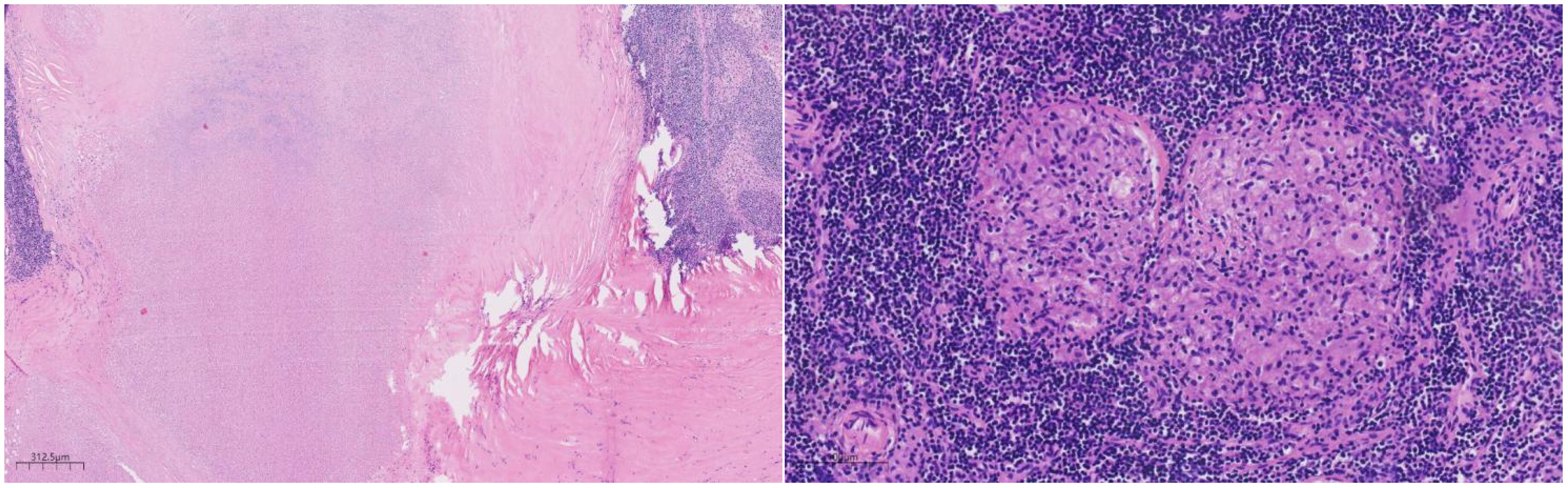 (2) Lymph node metastatic carcinoma is initially considered due to the presence of axillary lymphadenopathy in this patient with confirmed DCIS. However, given the patient’s prolonged residence in a tuberculosis-endemic area and a history of pulmonary tuberculosis spanning over a decade, additional evaluation is warranted. Histopathological examination reveals no features indicative of metastasis, and molecular testing for TB-PCR is positive, ruling out metastatic carcinoma and confirming tuberculous lymphadenitis.