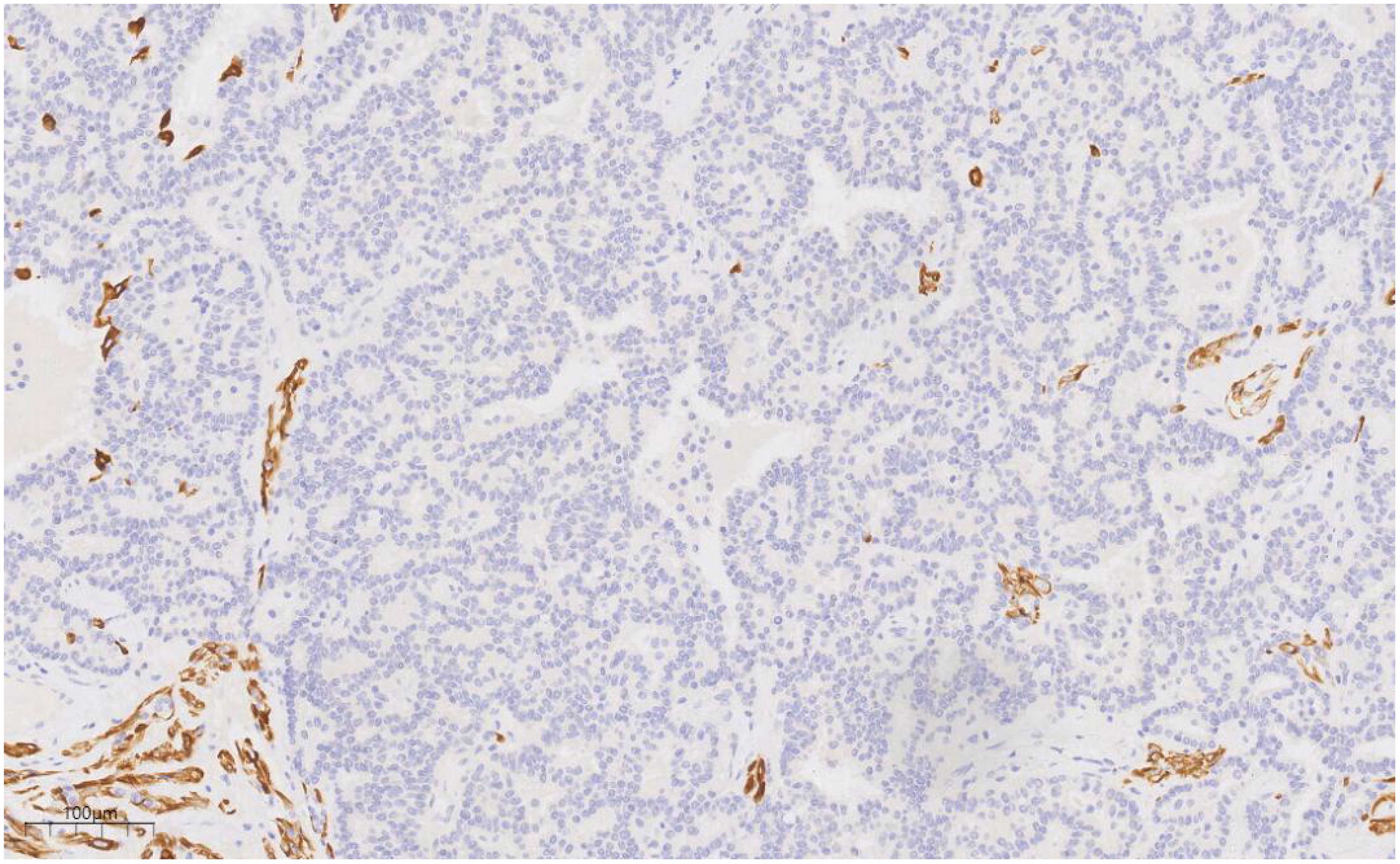 Immunohistochemistry is essential for the characterization of papillary lesions. In this case, myoepithelial markers, including p63 and basal cytokeratins (CK5/6), were consistently expressed along the majority of the papillary axes and ductal periphery, confirming the presence of an intact myoepithelial layer surrounding the papillary structure. In contrast, the epithelial component within the DCIS foci exhibited a uniform, monoclonal profile: tumor cells demonstrated strong and diffuse ER positivity, coupled with the complete absence of high molecular weight keratins (e.g., CK5/6). Immunohistochemistry also plays a crucial role in assessing invasion and refining the differential diagnosis. The loss of myoepithelial marker expression (e.g., p63, SMMHC) in the fibrovascular core or periphery of the lesion generally suggests papillary carcinoma over benign papilloma (9, 10). In this case, although focal attenuation of myoepithelial staining was observed within portions of the papillary axis, a continuous p63-positive myoepithelial layer encircled the ducts, supporting an in situ process. The immunophenotypic findings, in combination with the morphological features, confirm a predominantly benign papilloma with focal low-grade DCIS.