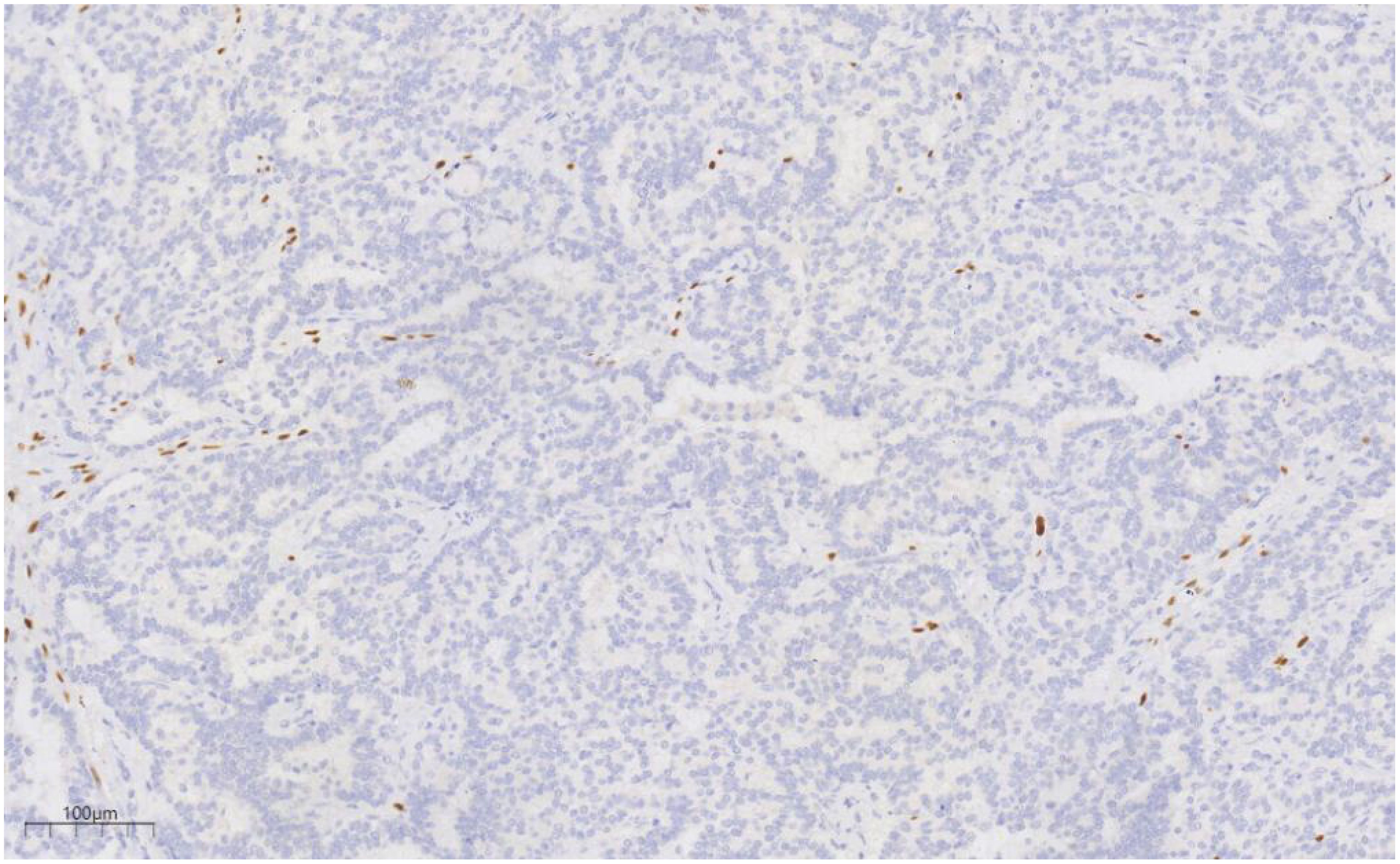 Immunohistochemical analysis revealed strong CK (+++) expression and focal CK5/6 (+) expression in the hyperplastic ductal epithelium. Co-expression of CK5/6 (Figure 6) and p63 (Figure 7) confirmed the presence of myoepithelial cells encircling the ducts, though some hyperplastic regions exhibited loss of myoepithelial cells. ER and PR were moderately positive, with expression levels exceeding 90%, HER2 was scored 0, and the Ki-67 labeling index was approximately 20%.