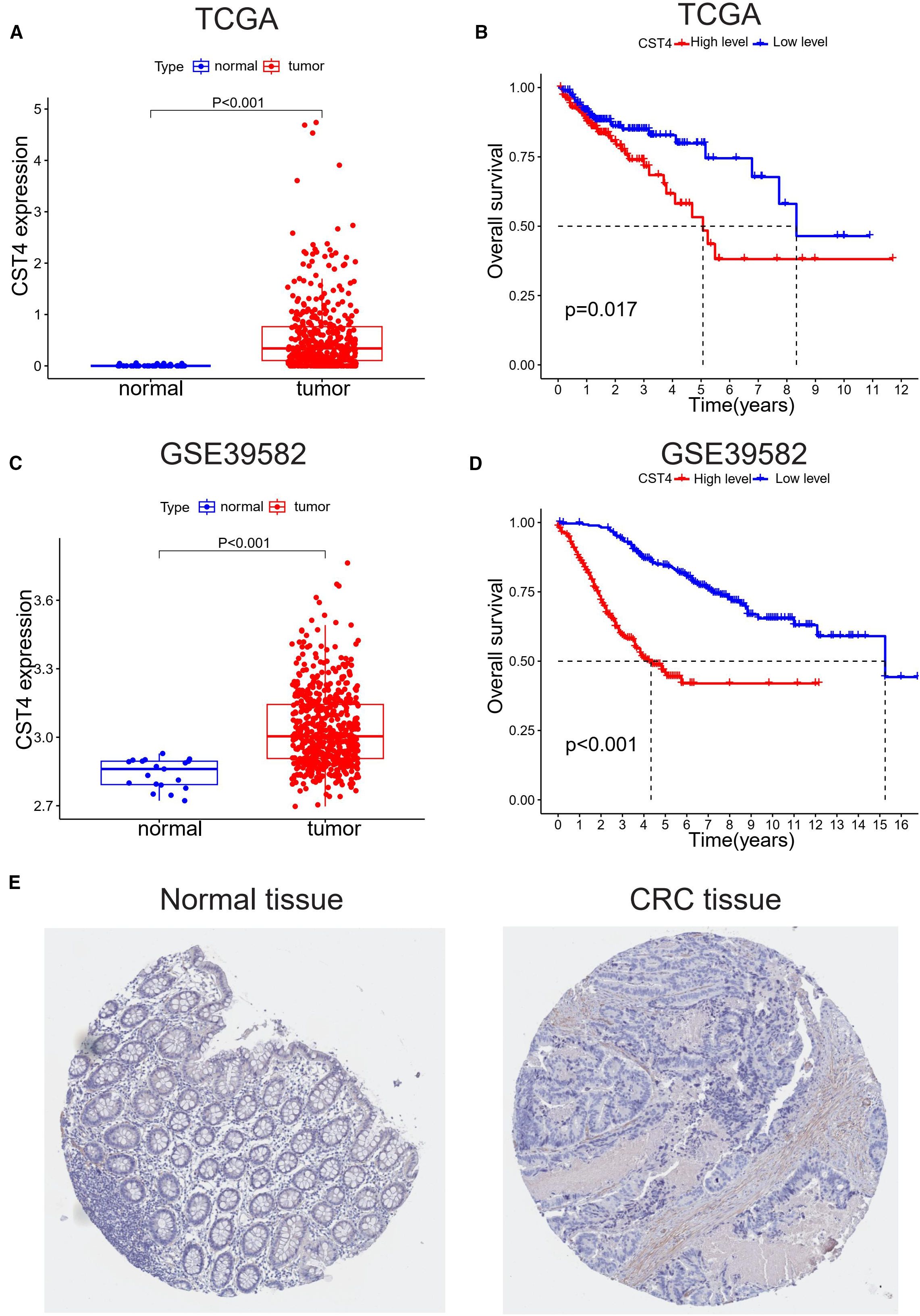 Figure 1. CST4 overexpression correlates with poor prognosis in colorectal cancer. (A, B) TCGA analysis: (A) CST4 mRNA is up-regulated in tumors vs. normal tissues (*P<0.001); (B) High CST4 predicts worse survival (P = 0.017). (C, D) GSE39582 validation: (C) Tumor CST4 elevation (*P<0.001); (D) Stronger survival disparity with high CST4 (*P<0.001). (E) Immunohistochemistry of minimal CST4 in normal colon vs. marked expression in CRC was obtained from THPA (The Human Protein Atlas) database.