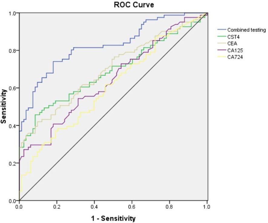 Fasting blood samples (3 mL) were collected from patients during their initial hospital admission using clotting tubes. After 30 minutes of room temperature incubation, samples were centrifuged at 3,000 rpm (≈ 1 500 × g, Sorvall Legend RT+, rotor 75003181) for 10 minutes to isolate serum. Serum CST4 levels were quantified using a commercially available enzyme-linked immunosorbent assay (ELISA) kit (Shanghai Liangrun Biomedical Technology Co., Ltd., catalog number: LR-ELISA-CST4-001) on a Tethys 145 automated analyzer. Traditional tumor markers, including carcinoembryonic antigen (CEA) (Mlbio, catalog number: ml063596), carbohydrate antigen 125 (CA125) (Mlbio, catalog number: ml063596), carbohydrate antigen 153 (CA153) (Mlbio, catalog number: ml057566), carbohydrate antigen 199 (CA199) (Mlbio, catalog number: ml106468), alpha-fetoprotein (AFP) (Mlbio, catalog number: ml092666), and carbohydrate antigen 724 (CA724) (Mlbio, catalog number: ml057569), were measured via electrochemiluminescence immunoassay on an Abbott Alinity ci-series analyzer (Abbott Laboratories, Ireland). Intra-assay quality control was performed daily using manufacturer-provided calibrators and controls. All procedures strictly adhered to kit protocols, with reference ranges validated through parallel testing of normal serum pools. Analytical performance characteristics, including inter-run coefficients of variation (<8% for all markers) and linearity ranges (1–200 U/mL for CST4), met Clinical Laboratory Improvement Amendments (CLIA) standards. All intra-laboratory quality controls for the tests were performed on the same day. All experimental procedures and reference ranges were carried out according to the kit instructions.