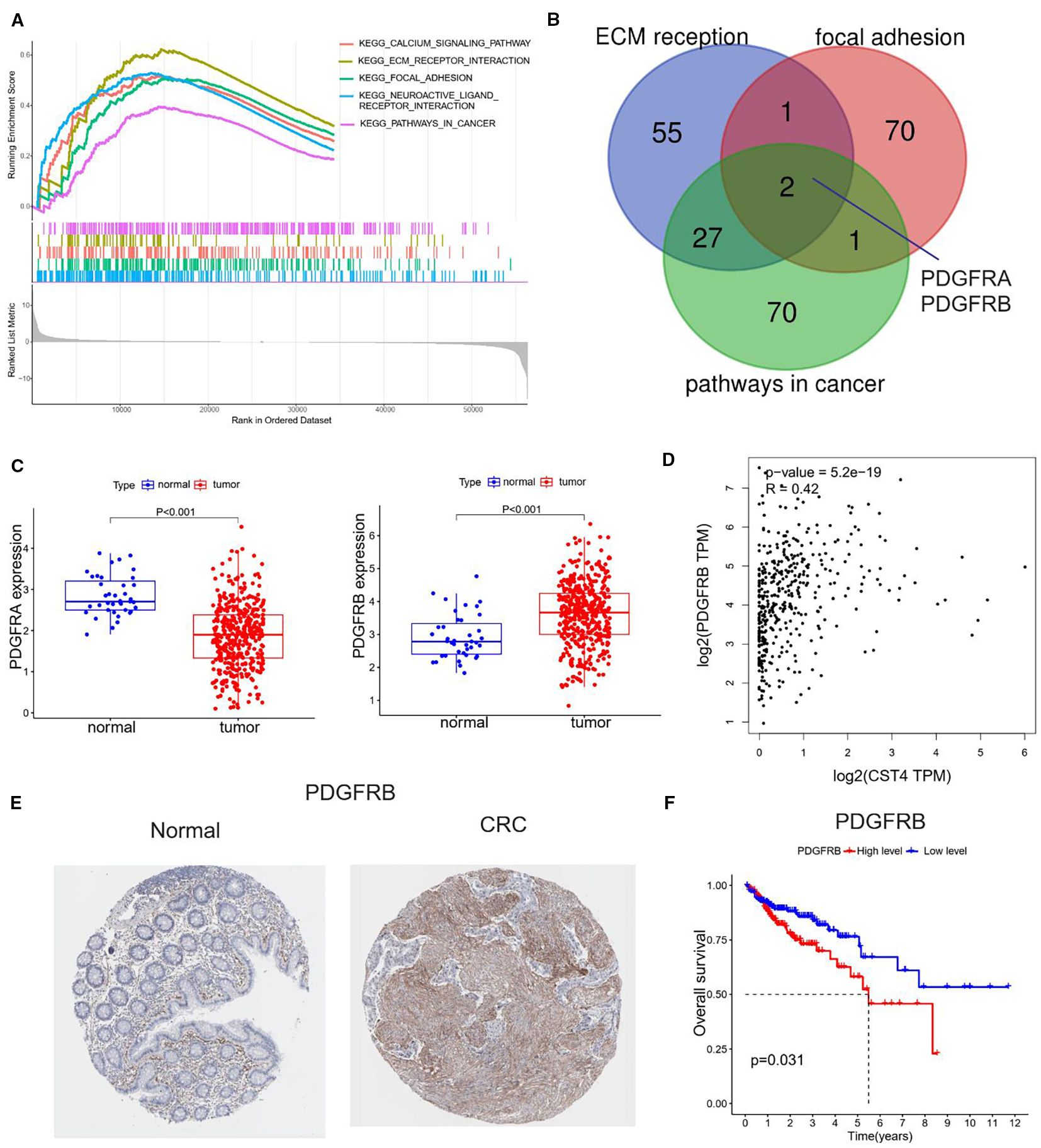Figure 3. Functional annotation and clinical relevance of CST4-associated pathways. (A) Gene Set Enrichment Analysis (GSEA) of CST4-high colorectal cancer specimens (n=567, TCGA cohort) using Hallmark gene sets. (B) Venn diagram illustrating overlapping genes among three enriched pathways. (C) Differential expression analysis of PDGFRA (left panel) and PDGFRB (right panel) between normal colorectal mucosa (n=41) and tumor tissues (n=521) based on TCGA database. (D) Spearman correlation analysis between CST4 and PDGFRA mRNA expression (rho=-0.37, P<0.001) in matched tumor samples. (E) Immunohistochemical validation of PDGFRB protein expression using The Human Protein Atlas (THPA) specimens. (F) Survival impact of PDGFRB. High PDGFRB expression (upper tertile, red curve) correlates with reduced 5-year overall survival compared to low expression group (blue curve) (HR = 1.82, 95% CI:1.23-2.70; log-rank P = 0.003).