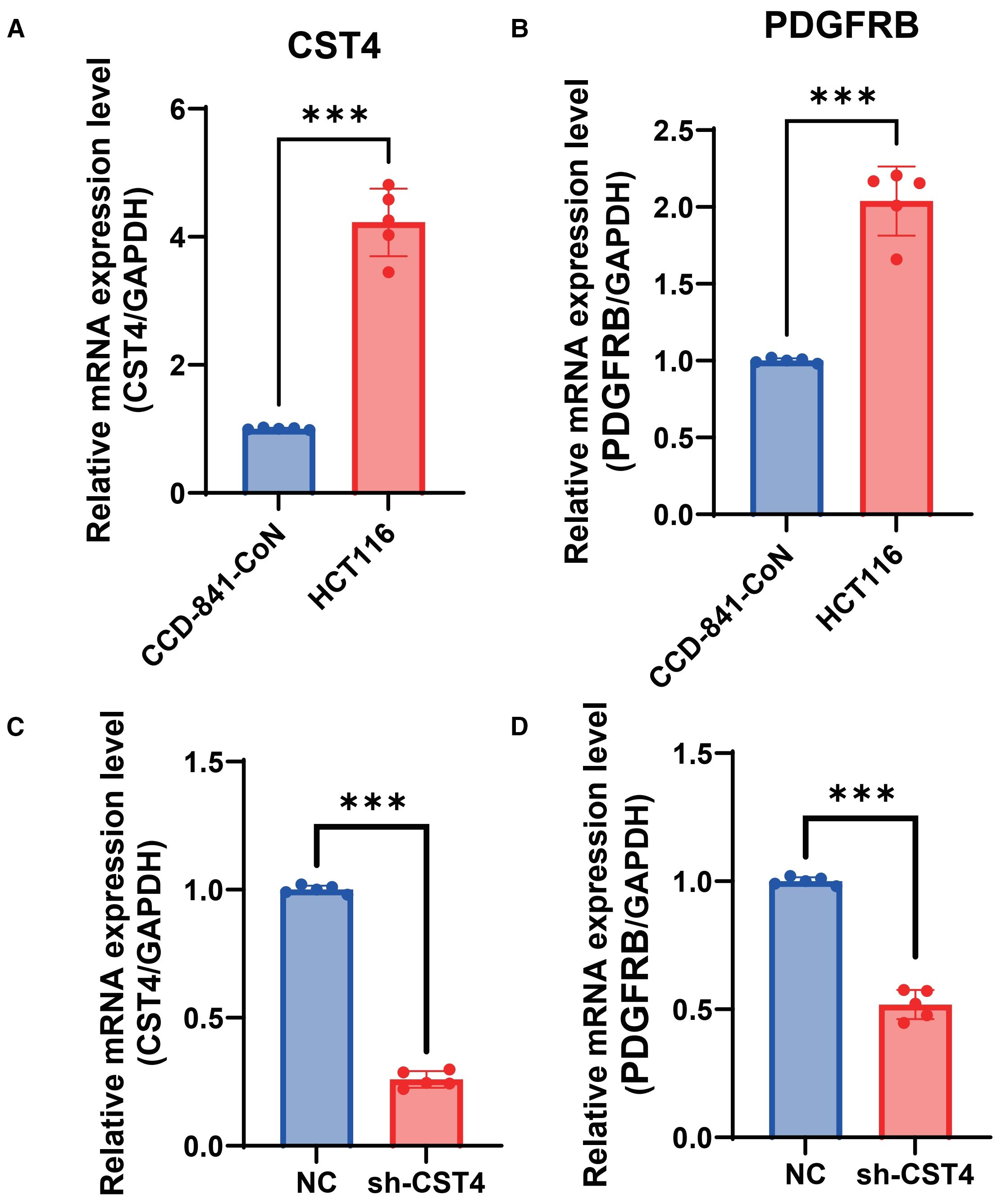 Figure 4. CST4 knockdown suppresses PDGFRB expression in colorectal cancer cells. (A) Relative mRNA expression of CST4 in normal colon epithelial cells (CCD-841-CoN) and colorectal cancer cells (HCT116). (B) Relative mRNA expression of PDGFRB in CCD-841-CoN and HCT116 cells. (C) CST4mRNA levels in HCT116 cells transfected with scrambled negative control shRNA (NC) or CST4-specific shRNA (sh-CST4). (D) PDGFRB mRNA expression in NC and sh-CST4 groups. Data represent mean ± SEM from three independent experiments (n = 3). ***P < 0.0001; unpaired Student’s t-test.