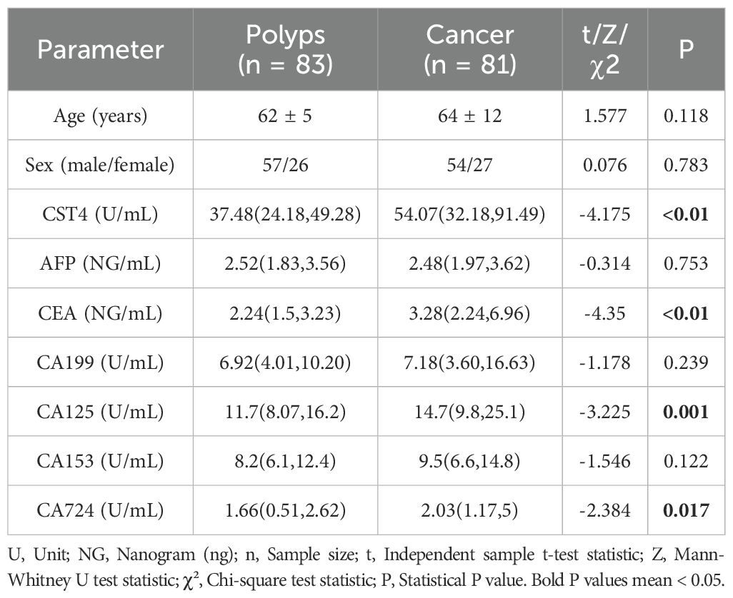 Serum CST4 levels demonstrated marked elevation in CRC patients compared to polyp controls (median [IQR]: 54.07 [32.18–91.49] U/mL vs. 37.48 [24.18–49.28] U/mL; P < 0.01). Among traditional tumor markers, CEA (3.28 vs. 2.24 ng/mL; P < 0.01), CA125 (14.7 vs. 11.7 U/mL; P = 0.001), and CA724 (2.03 vs. 1.66 U/mL; P = 0.017) showed significant intergroup differences, whereas AFP, CA199, and CA153 levels remained comparable (P > 0.05). Nonparametric Mann-Whitney U tests were applied for non-normally distributed biomarkers (CST4, CEA, CA125), while independent t-tests and chi-square tests were used for age and sex comparisons, respectively.