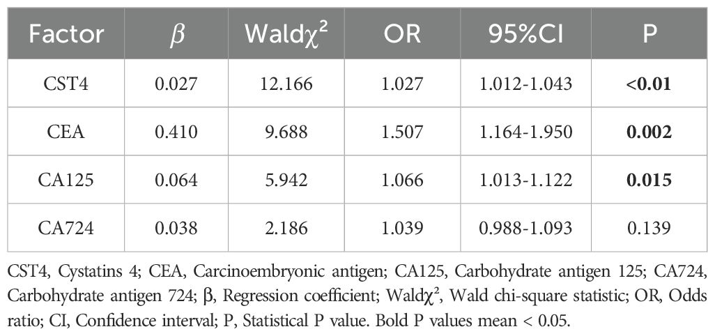 To establish the independent diagnostic value of CST4 in chemotherapy-treated CRC patients, we performed multivariate logistic regression analysis incorporating both novel and conventional biomarkers (Table 3). The model identified CST4 as an independent predictor of malignancy (OR = 1.027 per unit increase, 95% CI:1.012-1.043; P<0.001), demonstrating greater predictive power than CA125 (OR = 1.066, 95% CI:1.013-1.122; P = 0.015) and comparable to CEA (OR = 1.507,95% CI:1.164-1.950; P = 0.002). Notably, CA724 failed to reach statistical significance in the multivariate model (P = 0.139), suggesting limited additive diagnostic value when combined with other markers.