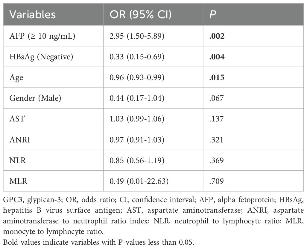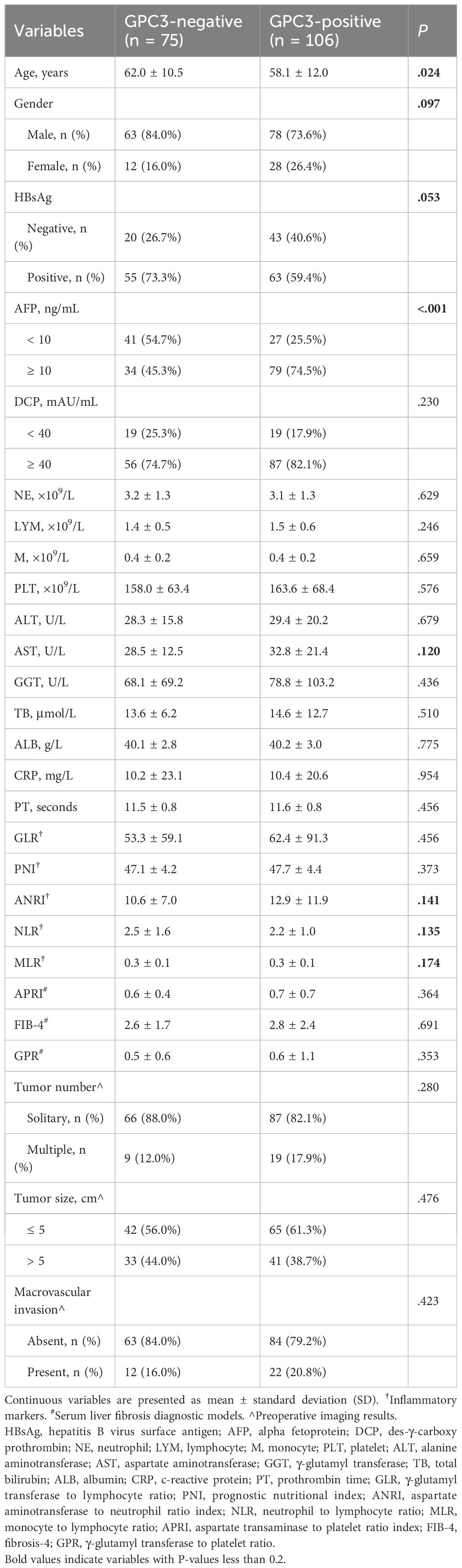 181 HCC patients from Nanjing Drum Tower Hospital who met the inclusion criteria were included in this retrospective case-control study. Supplementary Figure S2 is the detailed flowchart of this study. Among them, 75 (41.4%) were GPC3-negative HCC, and 106 (58.6%) were GPC3-positive HCC. Then, the comparison of clinical variables was performed between the two groups, as shown in Table 1. AFP ≥ 10 ng/mL, age, HBsAg-negative, gender-female, AST, NLR, ANRI, and MLR were more correlated with GPC3 expression (p<0.2). Lastly, as presented in Table 2, the multivariate logistic regression identified four variables as independent predictors for GPC3-positive (p<0.05) (Figure 2).