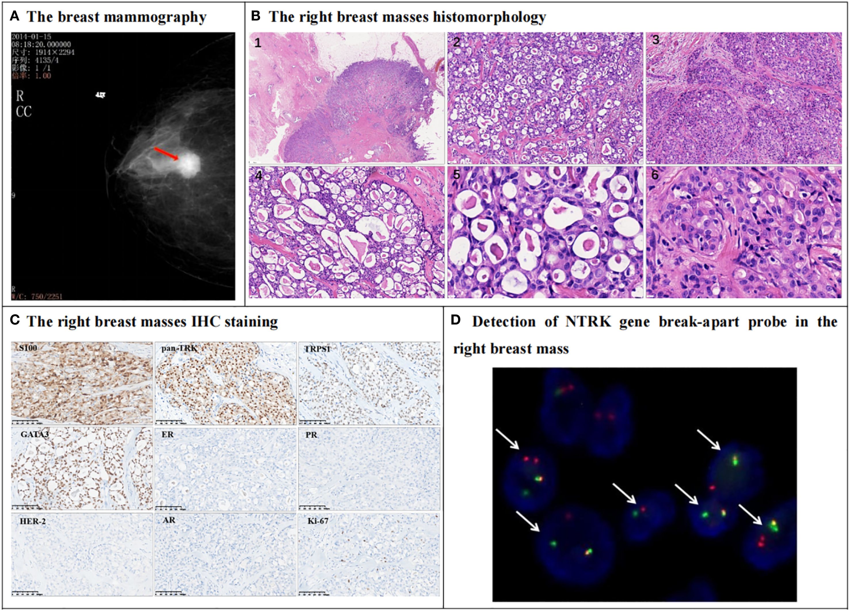 Figure 1. Mammography, histomorphology, immunohistochemical (IHC) and NTRK3 break-apart probe detection in the right breast mass. (A) The mammography indicates a high-echo nodule behind the right areola (red arrow), measuring 2.0cm by 1.5cm, and Breast Imaging-Reporting and Data System (BI-RADS) classification was 4B. (B) The right breast mass morphological of HE staining shows that the tumor is well-circumscribed with dilated mammary ducts observed in the adjacent tissue (B1). The tumor cells are arranged in a microcystic structure, and eosinophilic secretions can be seen inside the cysts, and collagen bundles are observed in the stroma (B2, 200X). Some tumor cells are arranged in a solid structure (B3, 200X). The cavities vary in size and their secretions are similar to thyroid colloid (B4, 200X). The nucleus is round or oval in shape, with fine chromatin and small nucleoli visible (B5, B6, 400X). (C) IHC shows that the tumor cells were positive for S-100, pan-TRK, TRPS1, GATA3. Estrogen receptor (ER) and progesterone receptor (PR) are negative, while HER-2 score is 0. Tumor cell was negative for androgen receptor (AR). The Ki-67 index is approximately 5%. (D) The FISH detection results of NTRK break-apart probe this probe show that 60% of the cells have dual-color separated fluorescence signals (white arrows), indicating a positive NTRK3 gene breakage and rearrangement (1000X).
