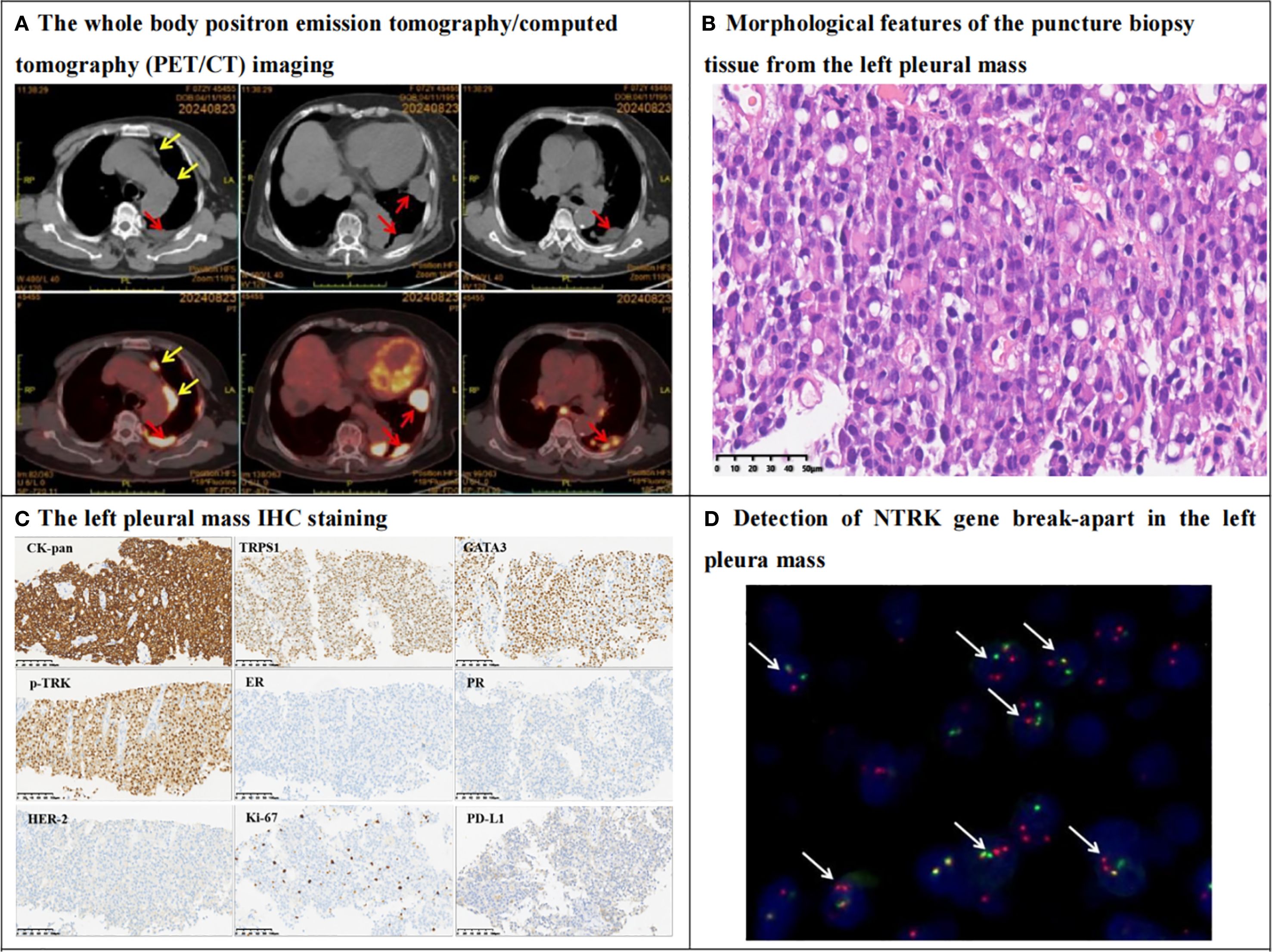 Figure 2. PET/CT, histomorphology, IHC and NTRK3 break-apart probe detection in the left pleura mass. (A) The whole body positron emission tomography/computed tomography (PET/CT) imaging revealed multiple nodules in the left pleura (red arrows), and the larger one was measured 3.3cm by1.8cm in size with standardized uptake value maximum (SUVmax) was equal to 10.19. The radioactive uptake of multiple hilar and mediastinal lymph nodes (yellow arrows) were abnormally increased, with SUVmax was equal to 10.62. (B) Hematoxylin-eosin staining (HE) showed that tumor cells are diffusely proliferating, with abundant eosinophilic cytoplasm or vacuolated, the tumor cells are relatively mild, with fine nuclear staining, no nucleoli, and no mitotic figures. Eosinophilic secretions are seen in the stroma (400X). (C) IHC shows that tumor cells express epithelial marker CK-pan, breast origin marker TRPS1, GATA3, and secretory carcinoma-specific marker pan-TRK. Tumor cells are negative for ER and PR, Her2 score is 1+, Ki67 proliferation index is approximately 10%. PDL1 CPS is 5. Envision method, 200X. (D) The Fluorescence In Situ Hybridization (FISH) of NTRK3 probe show that 75% of the tumor cells have dual-color separated fluorescence signals (white arrows), indicating a positive NTRK3 gene breakage and rearrangement (1000X).