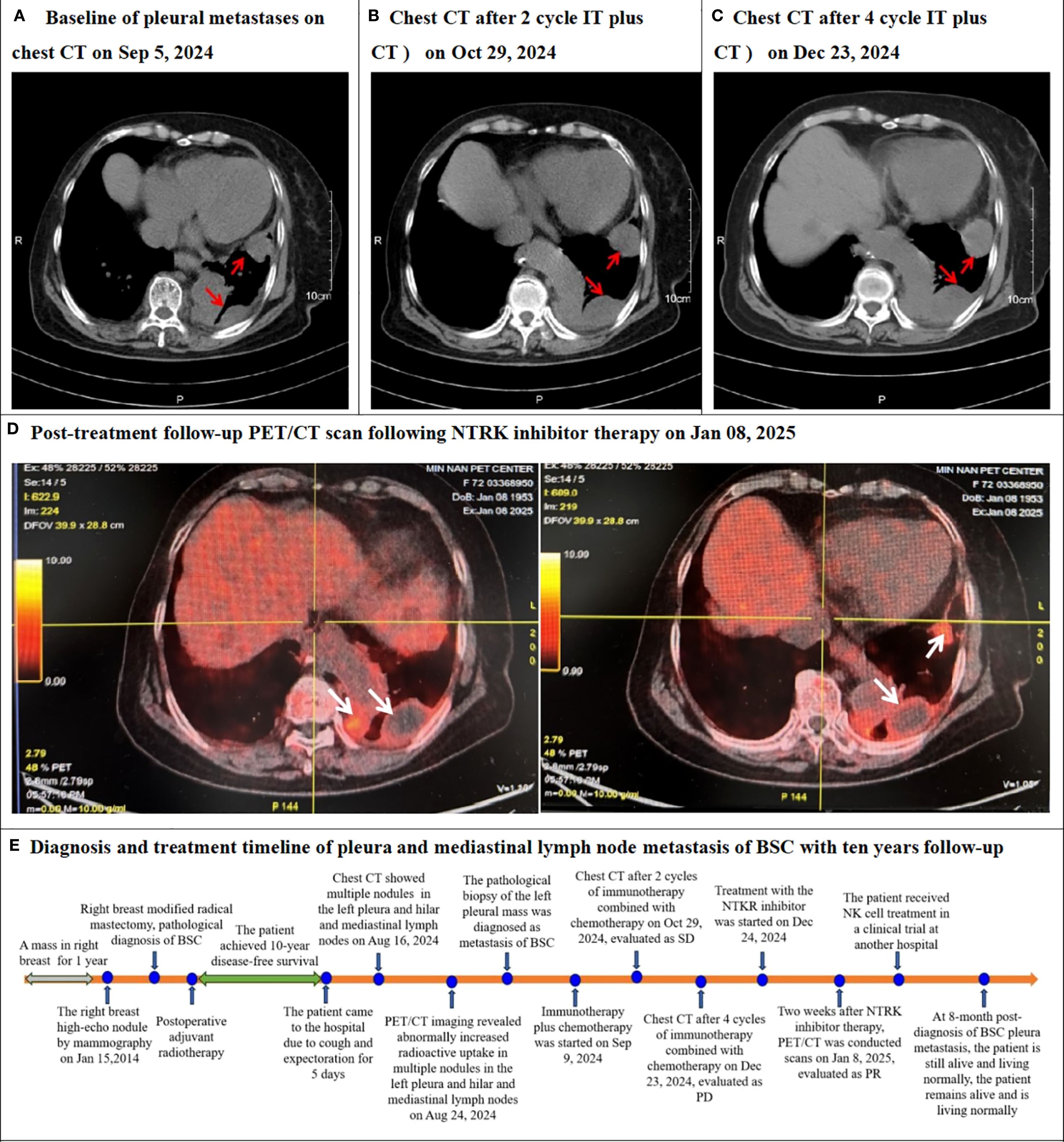 Upon receiving a definitive diagnosis of pleura and mediastinal lymph node metastasis of BSC, the patient began receiving immunotherapy combined with chemotherapy on Sep 9, 2024. The treatment regimen consisted of 240mg of toripalimab on day 1, combined with 100mg of albumin-bound paclitaxel on days 1 and 8. This regimen represents the standard first-line treatment for metastatic triple-negative breast cancer in China (5). Compared with a baseline of pleural metastases on chest CT on September 5, 2024, with a maximum diameter of 33.3 mm (Figure 3A) before immunotherapy plus chemotherapy, the patient was evaluated as having stable disease (SD), with a maximum diameter of 39.1 mm based on a chest CT scan conducted on October 29, 2024 after two cycles of therapy (Figure 3B). However, following an additional four cycles, the patient’s condition progressed to progressive disease (PD), with a maximum diameter of 43.9 mm by a chest CT scan on December 23, 2024 (Figure 3C). Due to the NTRK gene fusion, the patient was administered oral NTRK inhibitor entrectinib capsules. Two weeks into the NTRK inhibitor treatment, the patient underwent a PET/CT reevaluation on January 8 2025 (Figure 3D), which revealed a reduced range of glucose metabolism and a decreased SUVmax, indicating a partial response (PR). The patient ceased taking the NTRK inhibitor due to severe joint pain. Subsequently, the patient was enrolled in a clinical trial for NK cell therapy at another hospital. As of the manuscript submission date, the patient remains alive and lives normally. Diagnosis and treatment timeline of pleura and mediastinal lymph node metastasis of BSC with ten years follow-up in Figure 3E.