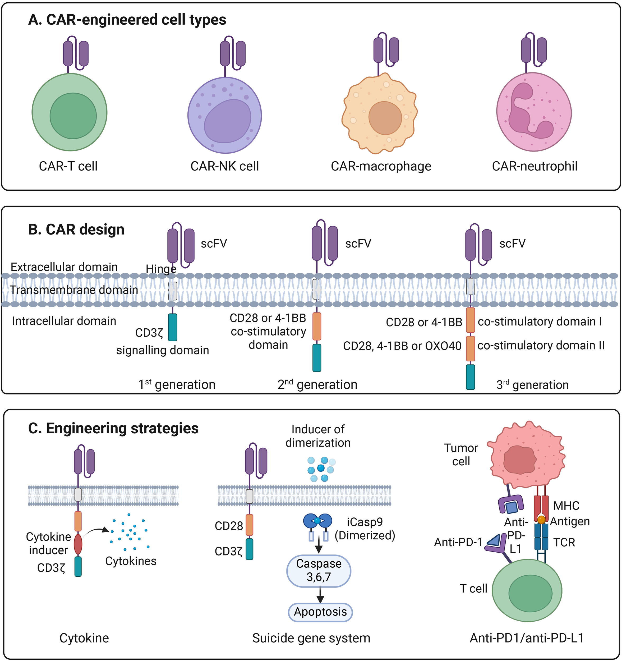Introduction to CAR engineering. (A) Illustration of the four major types of CAR-engineered immune cells, including CAR-T cells, CAR–natural killer (CAR-NK) cells, CAR–macrophages, and CAR–neutrophils, each providing distinct mechanisms of antitumor activity. (B) Schematic representation of first-, second-, and third-generation CAR designs. Each CAR consists of an extracellular single-chain variable fragment (scFv) for antigen recognition, a hinge region, a transmembrane domain, and one or more intracellular signaling domains. First-generation CARs contain the CD3ζ signaling motif alone; second-generation CARs add a single co-stimulatory domain (CD28 or 4-1BB); and third-generation CARs incorporate two co-stimulatory domains (e.g., CD28 plus 4-1BB or OX40) to enhance activation, persistence, and cytotoxicity. (C) Overview of advanced CAR-engineering strategies, including cytokine engineering to augment proliferation and survival, incorporation of a suicide gene system such as inducible caspase-9 (iCasp9) to allow controlled apoptosis, and checkpoint blockade via anti-PD-1/anti-PD-L1 modules to overcome T-cell exhaustion and suppress inhibitory signaling within the tumor microenvironment.