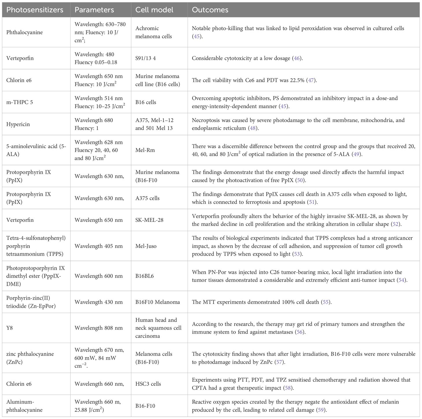 Many PS classes have been studied for PDT therapy of metastatic melanomas Table 1 (60). There are many things to consider when deciding the kind of PS to use with a certain PDT intervention, including its properties, method of action, localization, and kind of cellular demise it causes. PDT-utilized PSs are divided into three generations according to their photochemical and photophysical characteristics in relation to their cellular mode of action (61). First-generation PSs have significant side effects and often cause vascular tissue damage as their localization, suggesting that their exact location inside the intended cells is constrained (62). Second-generation PS often only has cytotoxic effects on tumor cells (63). To enhance the specific cellular drug absorption and uptake of photosynthetic medicines, third-generation PSs have been supplemented with additional targeted biomolecules (64).