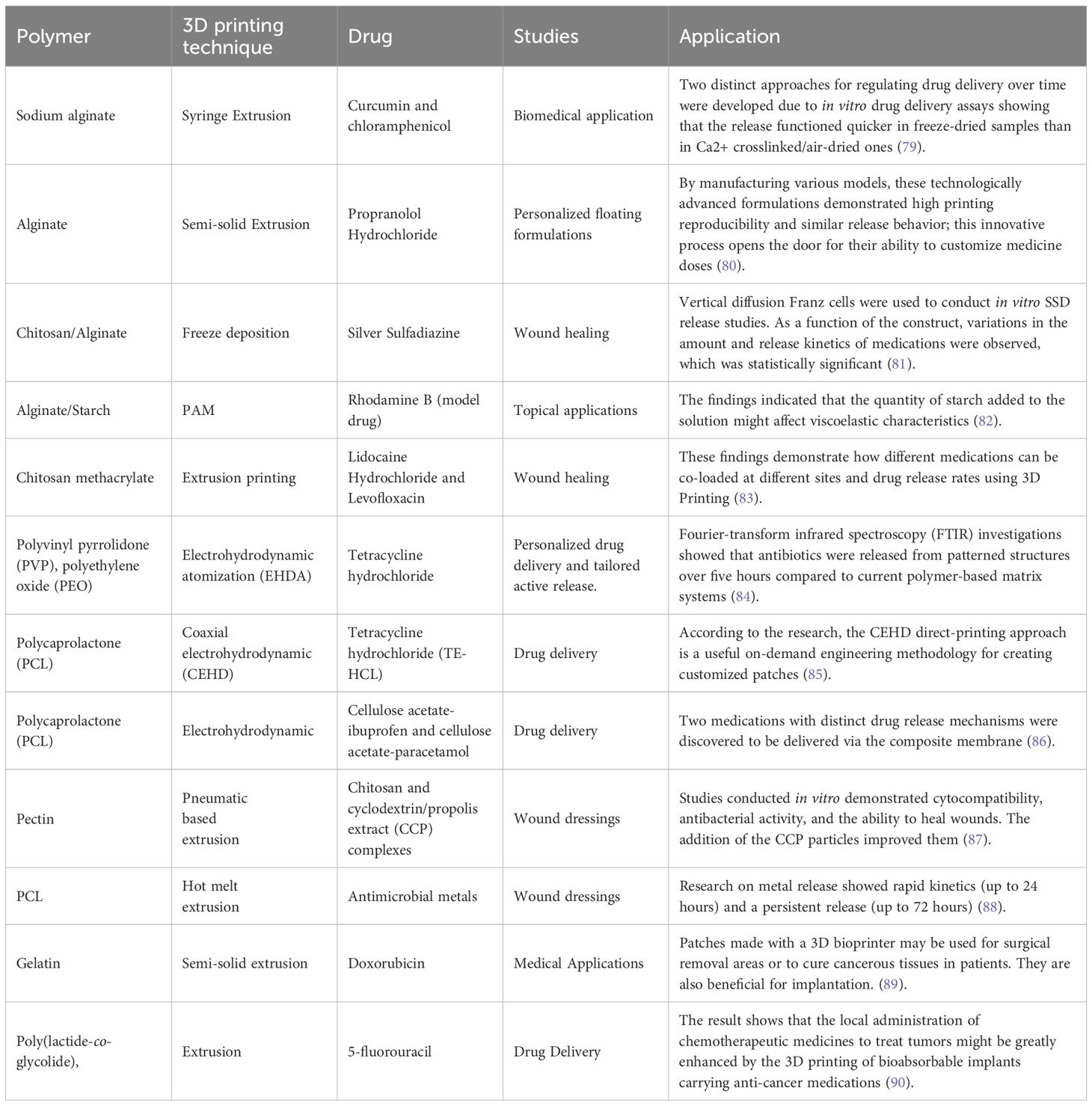 Consequently, the two patch designs that maximize the percentage of deliveries that can be achieved are the same as the maximum rate that the stratum corneum’s physiology naturally permits. The drawbacks highlight how inappropriate such technologies are for quick, bolus-style medication delivery. Another significant drawback is that these systems depend on the kind of medicine. This restriction has significantly limited the drug palette in the past. It presents substantial obstacles to the transdermal distribution of various medications, including peptides and macromolecules, with greater molecular weights or hydrophilic characteristics (76). Several permeability-enhancing techniques have been developed to overcome these restrictions (77). These techniques use both passive and active ways to increase drug transportation by altering the permeability of the skin. It is noteworthy, however, that the bulk of these methods has been linked to exorbitant expenses, skin irritation, or even discomfort (76, 78). Table 2 shows different studies on topical patch systems using 3D printing.
