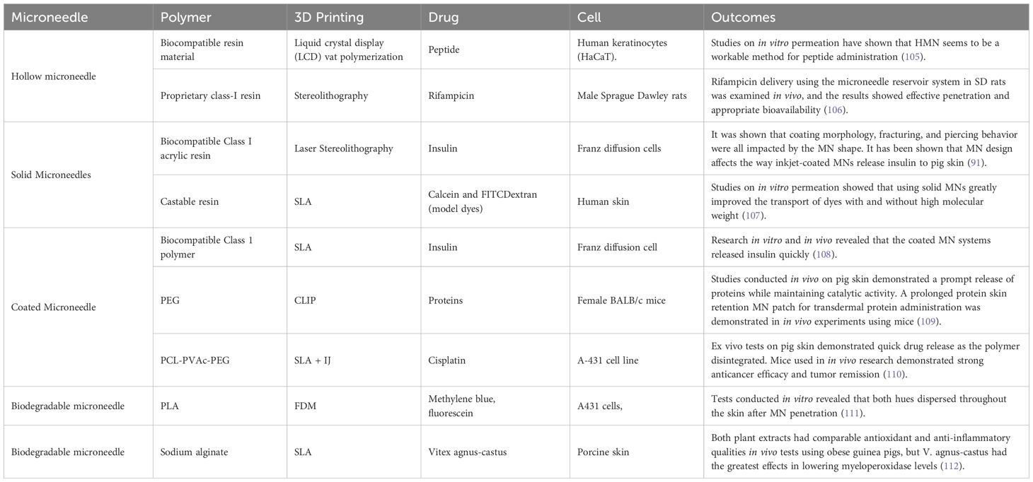 Hydrogel-based MN drug delivery functions by putting the needle inside the skin, letting the medicine out, and then throwing away the needle. Due to their hydrophilous properties, materials with appropriate swelling characteristics and biocompatibility should be used for hydrogel-based microneedles (97). Aung and colleagues examined the swelling of hydrogel-based microneedles. Even with their little distortion, the microneedles maintained their mechanical strength (104). Table 3 illustrates current investigations on 3D-printed transdermal microneedle systems.