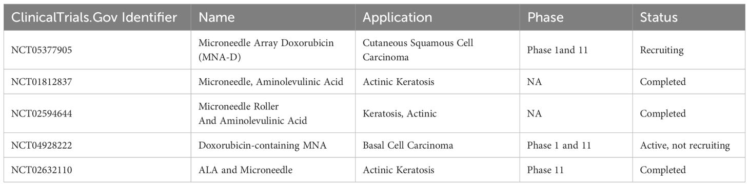 Microneedle-based patches are rapidly advancing in skin cancer research, and the current clinical trial landscape is summarized in Table 4.