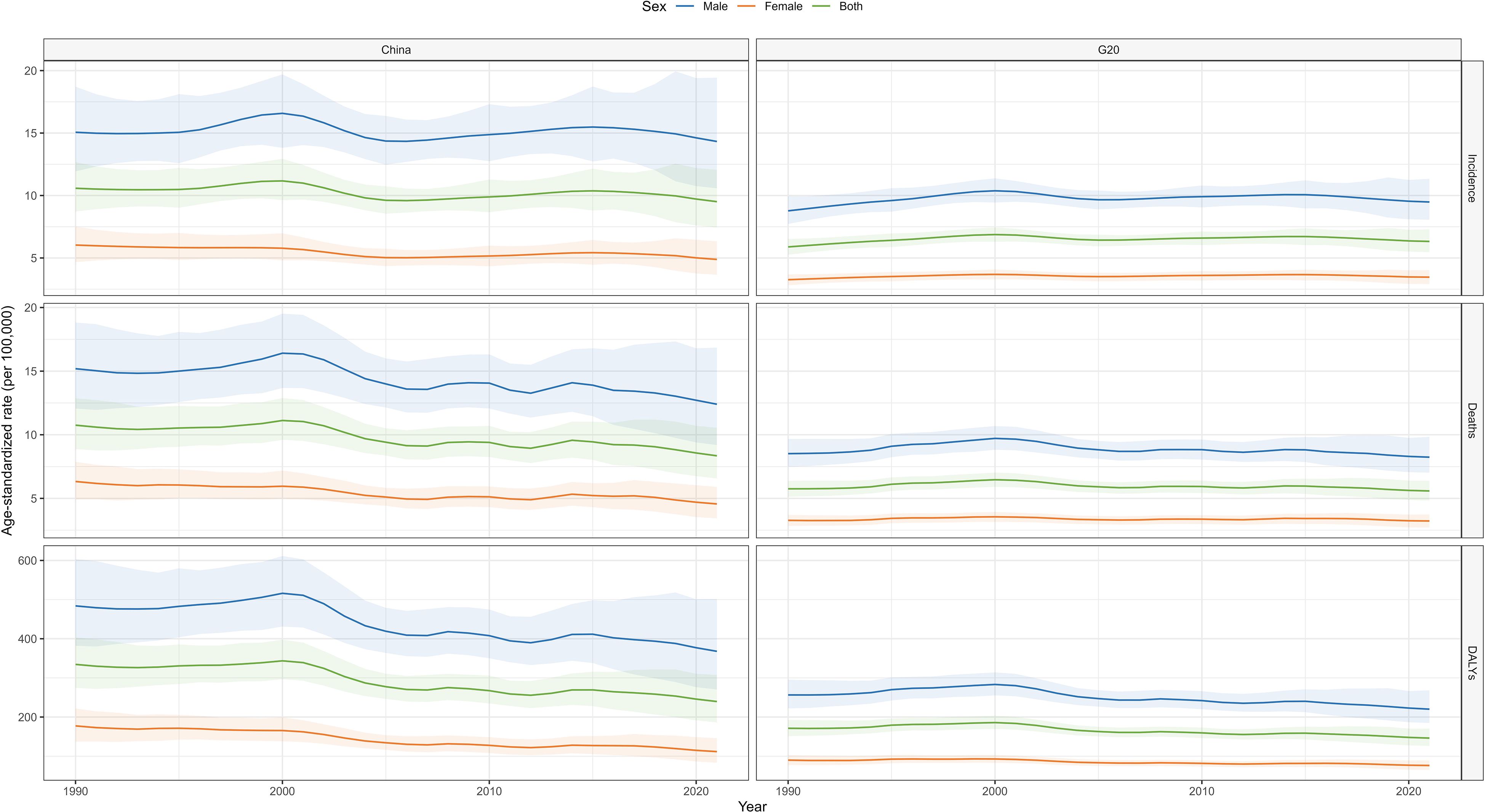 Between 1990 and 2020, trends in liver cancer burden differed by sex in China and G20 countries. In China, male, female, and overall ASIR initially increased and then declined; the male rate was higher than the female rate and exhibited greater fluctuation. In G20 countries, ASIR remained relatively stable; male rates exceeded female rates but displayed smaller fluctuations. For ASMR, China’s male, female, and overall rates initially rose and then fell; male rates were significantly higher than female rates, peaking around 2000 and then declined. G20 country ASMR trends were flat, with male rates higher than female rates and minimal fluctuation. For ASDR, China’s male, female, and overall rates initially increased and then decreased; male values were higher and more variable. G20 countries showed stable ASDR trends, with male rates exceeding female rates and small fluctuations. Overall, China’s liver cancer–related indicators exhibited greater variability than those of G20 countries, and, in most years, China bore a relatively heavier disease burden. Men consistently exhibited higher rates than women across all indicators (Figure 2).