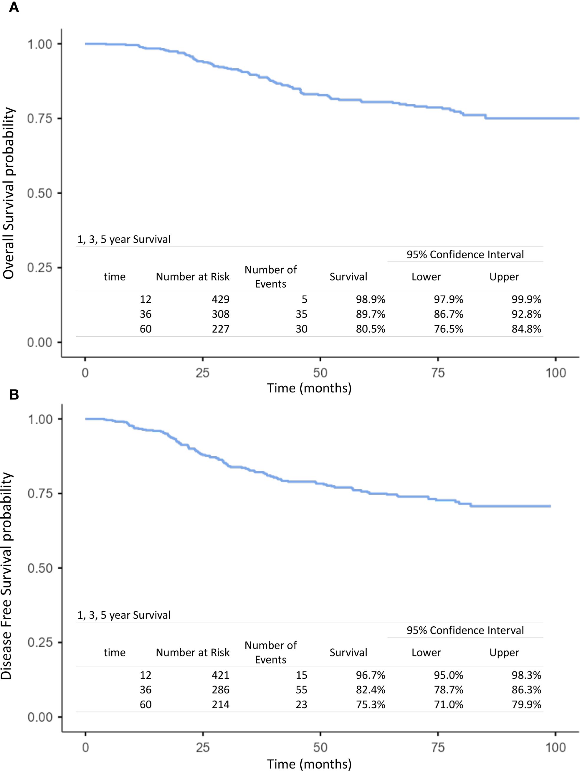 Figure 1. Kaplan–Meier curves of overall survival (A) and disease-free survival (B) at 1, 3, and 5 years in the overall population (operable breast cancer and inflammatory breast cancer).