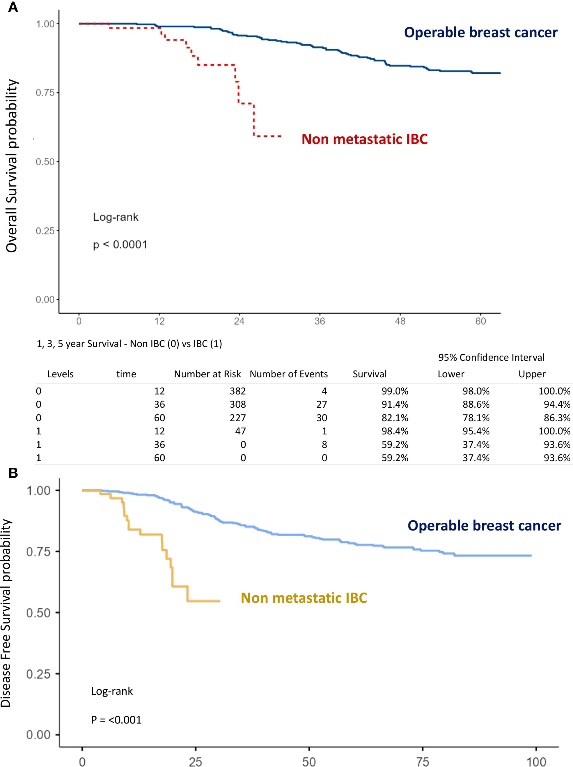 Figure 2. Kaplan–Meier curves of overall survival (A) and disease-free survival (B) comparing operable non-inflammatory breast cancer and inflammatory breast cancer.