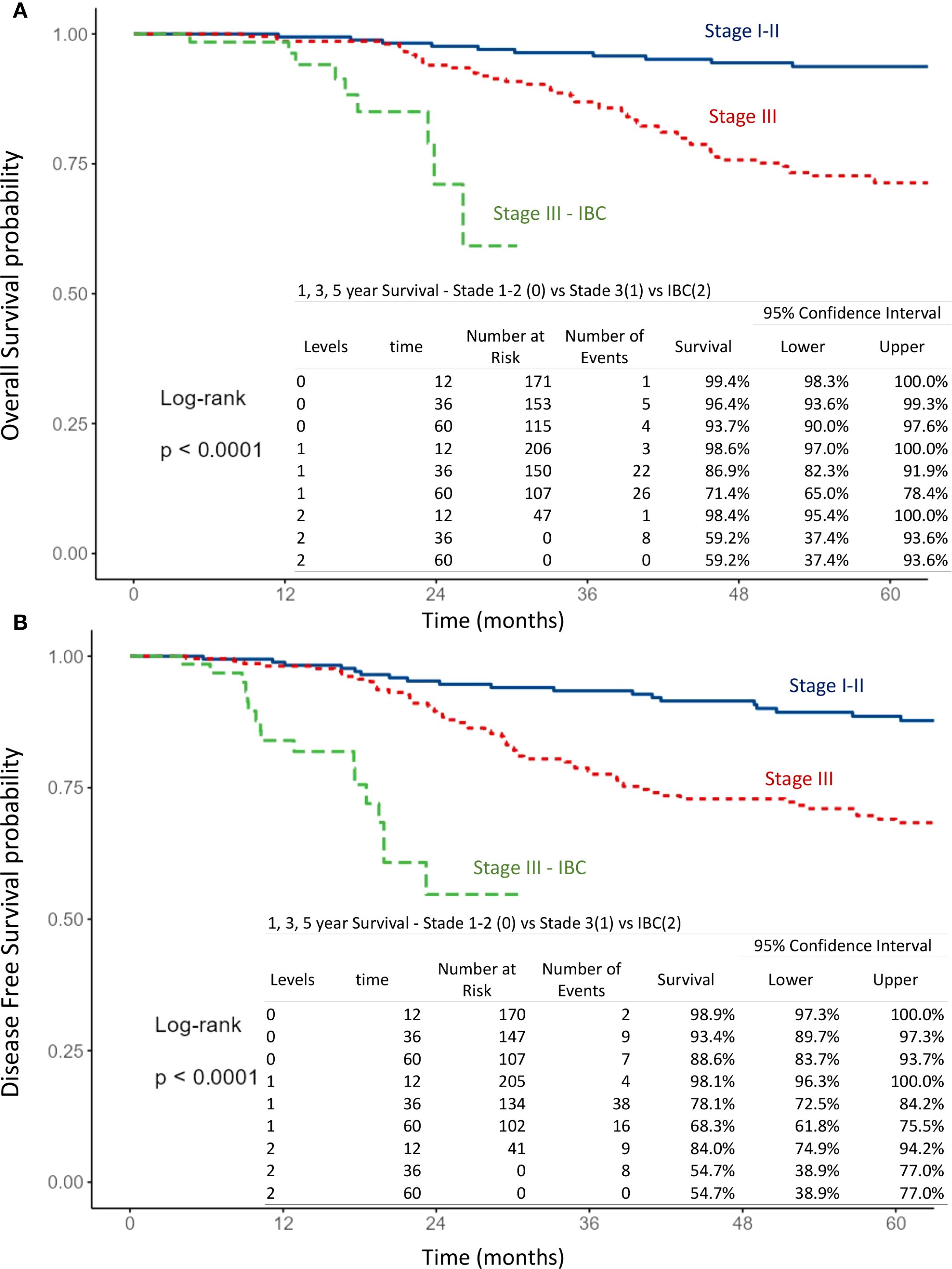 ● Advanced disease: IBC vs. stage III non-IBC (OS and DFS: p < 0.0001) (Figures 3A, B),