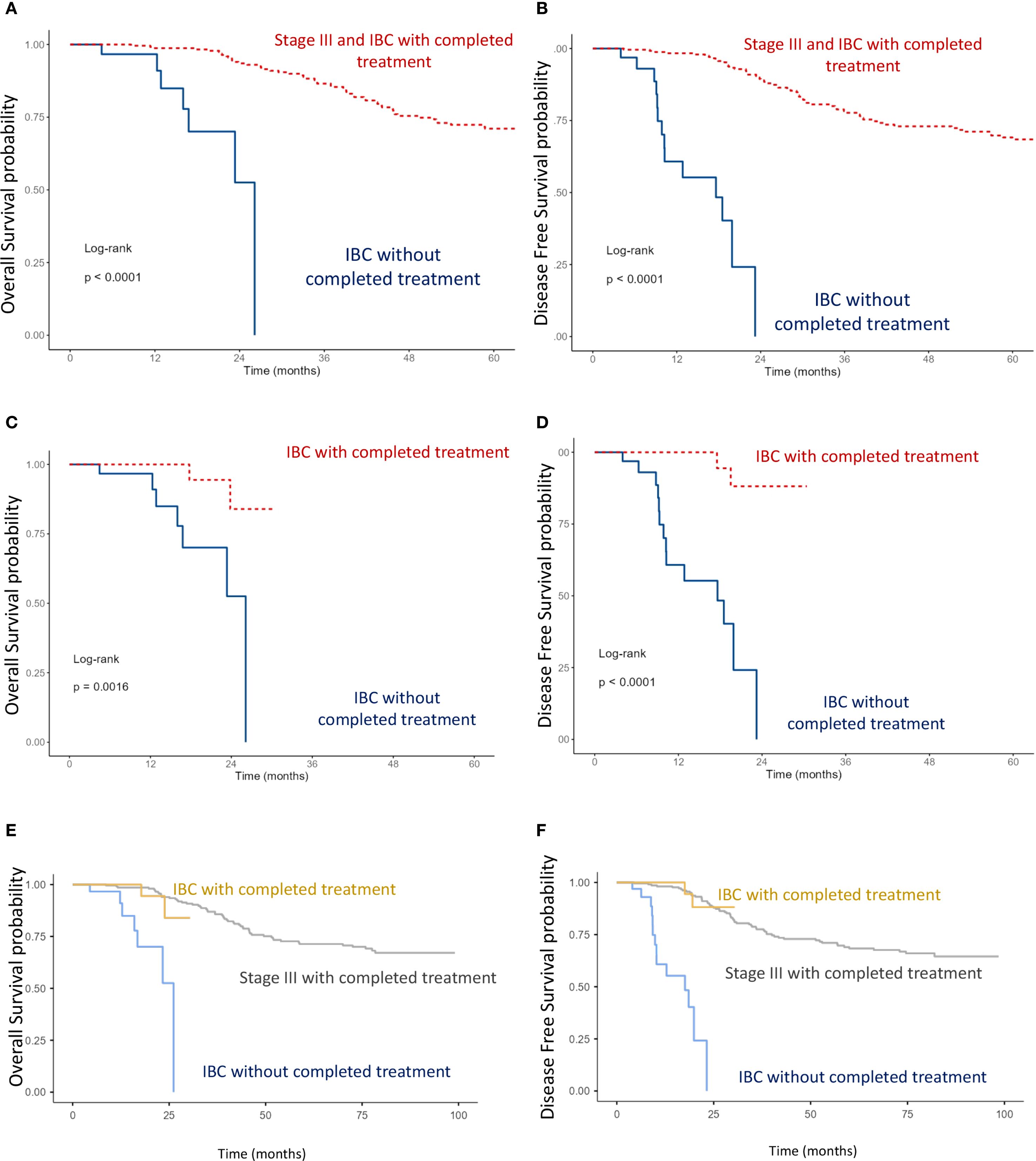 Figure 4. Kaplan–Meier curves of overall survival (OS) and disease-free survival (DFS): (A, B) Comparison between stage III including IBC with completed multimodal treatment, and IBC without completed multimodal treatment. (C, D) Comparison between IBC with completed versus IBC without completed multimodal treatment. (E, F) Comparison between stage III, IBC with completed multimodal treatment, and IBC without completed multimodal treatment (log-rank test).