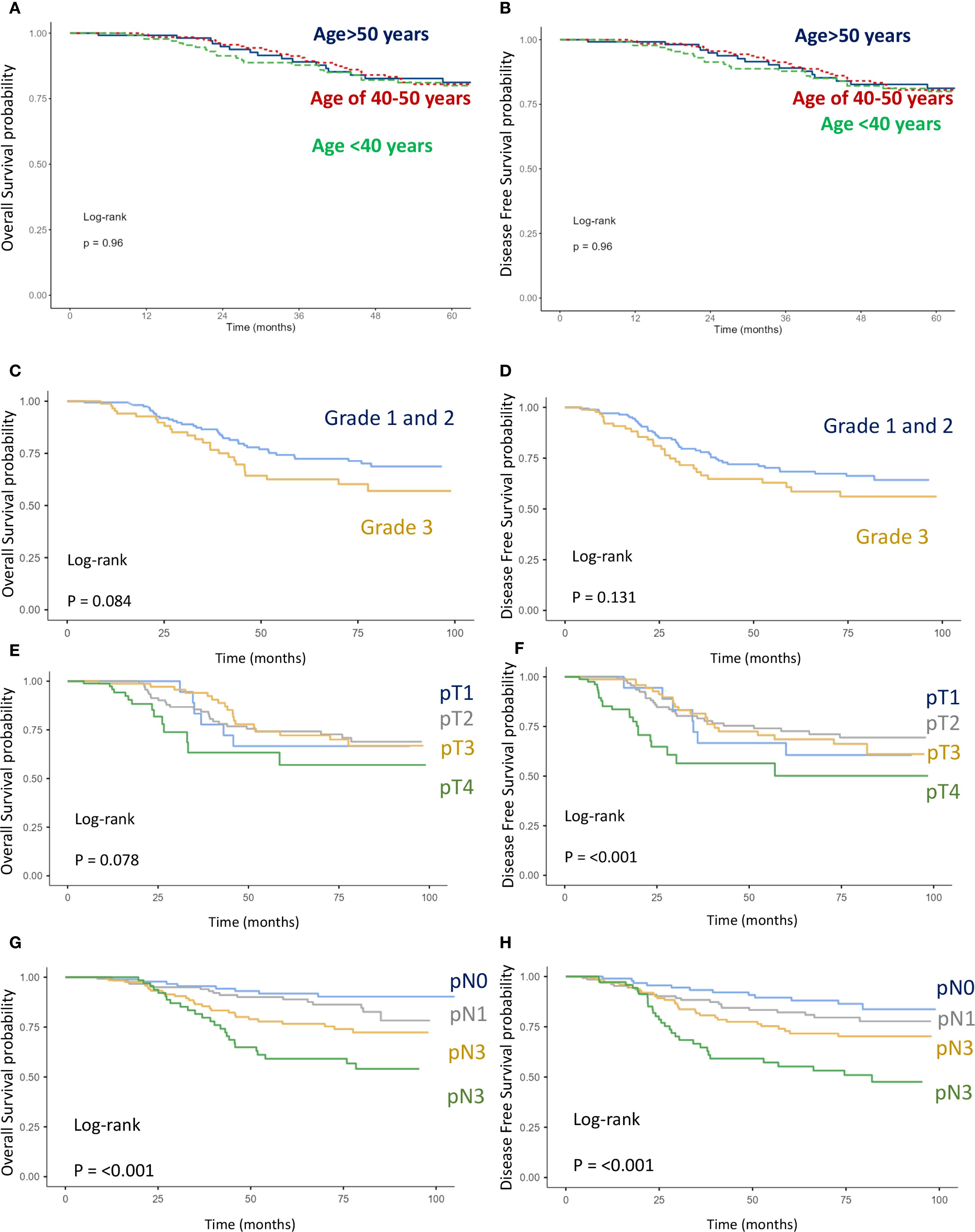 Figure 5. Kaplan–Meier curves of overall survival (OS) and disease-free survival (DFS). (A, B) Comparison between age intervals including age <40, age 40-50, and age >50. (C, D) Comparison between grade 1–2 and grade 3. (E, F) Comparison between stages pT1, pT2, pT3, and pT4 (G, H) Comparison between stages pN1, pN2, pN3, and pN4.