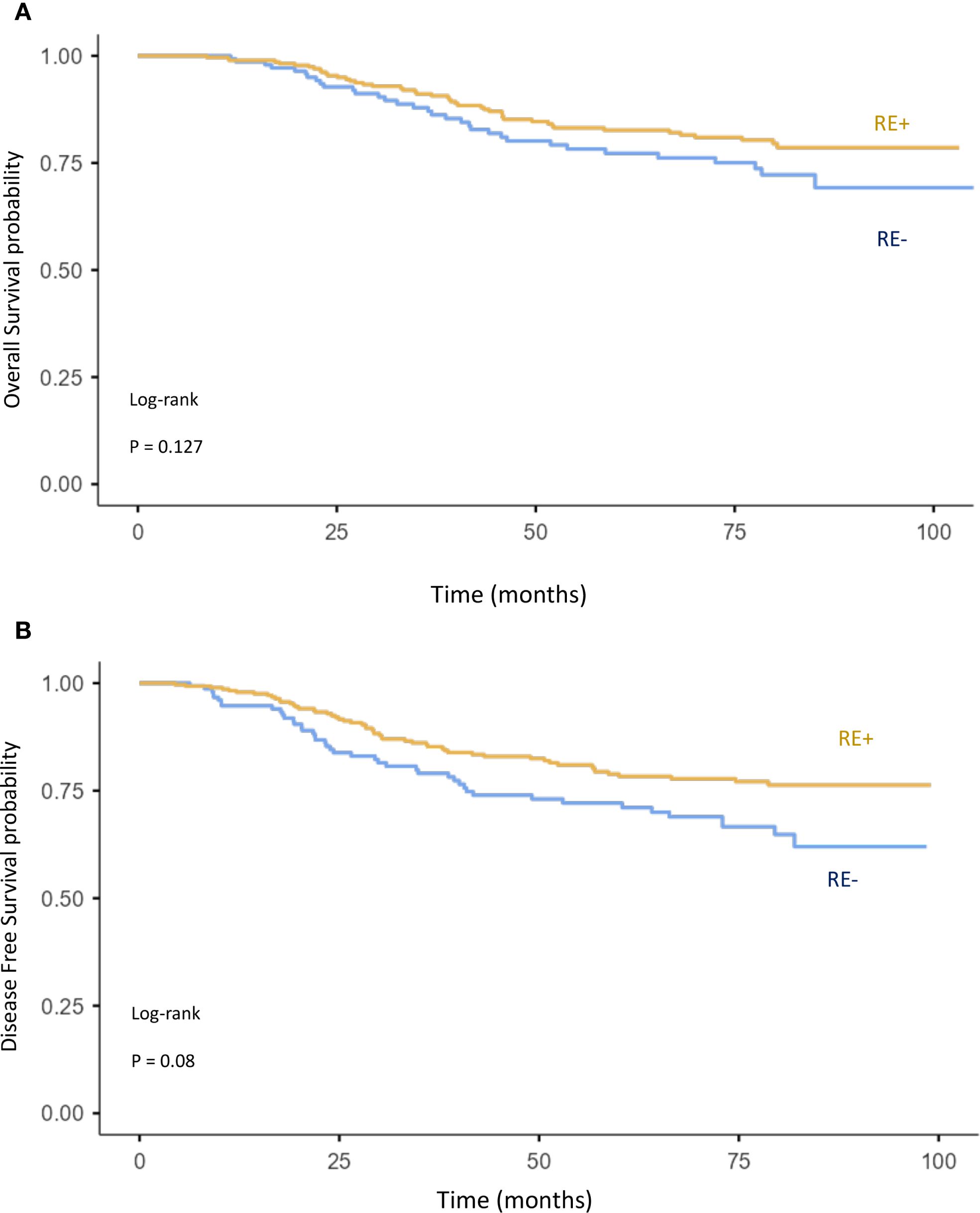 Figure 6. Kaplan–Meier curves of overall survival (A) and disease-free survival (B) comparing ER+ and ER− breast cancer.