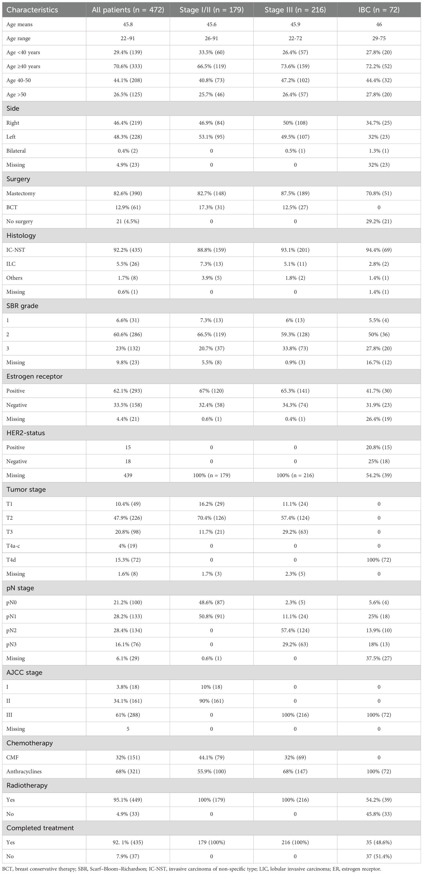 From the database of the National Institute of Oncology of Rabat using the predefined criteria, we identified 400 patients diagnosed with operable breast cancer and 72 patients diagnosed with non-metastatic inflammatory breast carcinoma. Table 1 summarizes patients’ demographics and tumor characteristics in the overall population (n = 472), as well as in stage I–II (n = 179), stage III (n = 216), and IBC subgroups (n = 72).
