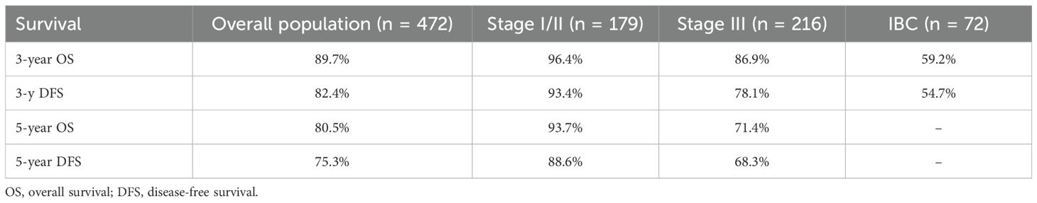 The 1-, 3-, and 5-year DFS rates in the overall population were 96.7%, 82.4%, and 75.3%, respectively (Figure 1B). DFS at 1 and 3 years was significantly higher in non-IBC patients compared with IBC patients (p < 0.0001) (Figure 2B). By stage, DFS at 1 and 3 years was 98.9% and 93.4% in stage I–II, 98.1% and 78.1% in stage III, and 84% and 54.7% in IBC, respectively (p < 0.0001) (Figure 3B).