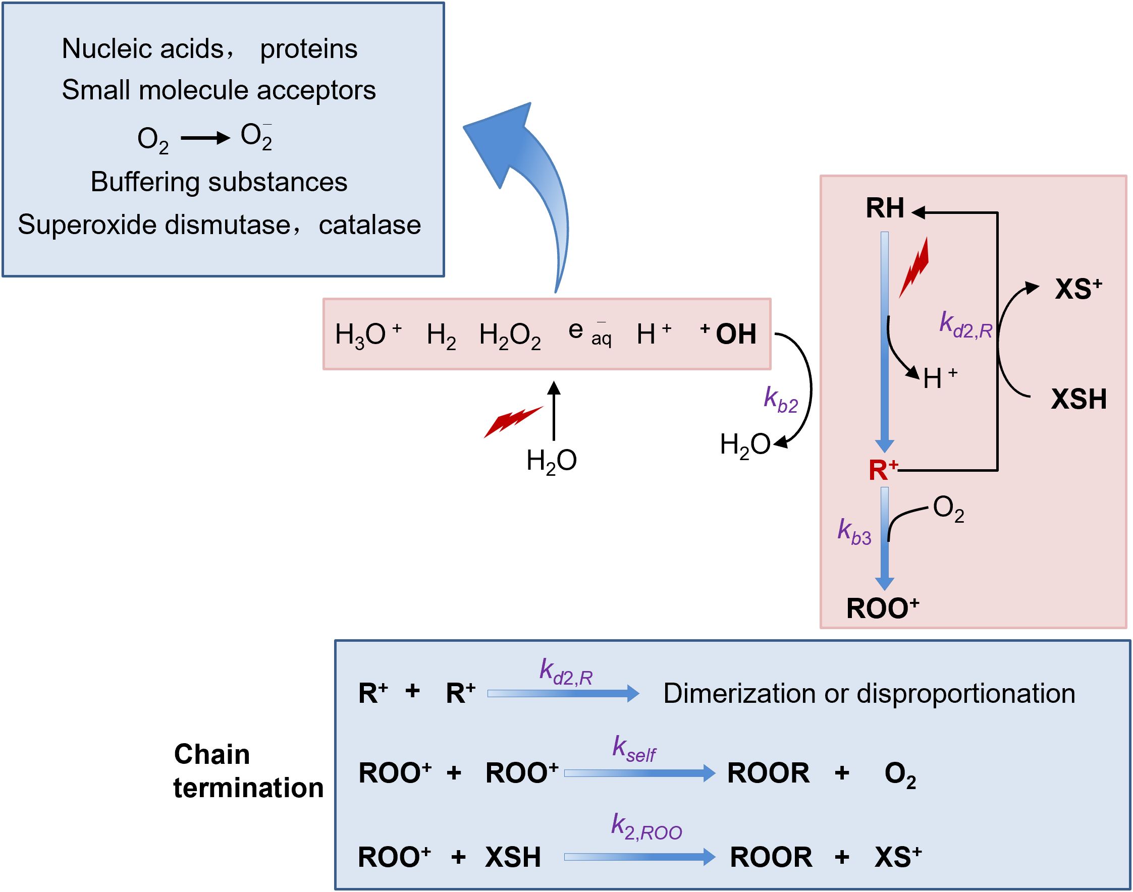 In the context of FLASH-RT, which is characterized by high dose-rates, an interesting phenomenon occurs with free radicals. At these high dose-rates, a large number of free radicals are generated instantaneously, resulting in a transiently high concentration. Under such conditions, there is an increased probability for free radicals to react with each other (36, 48). This intermolecular reaction between free radicals can lead to the formation of more stable molecules. As a consequence, the overall number of free radicals available to cause damage to cells is reduced. However, free radicals also have another reaction pathway. They can react with molecular oxygen to form reactive oxygen species (ROS), which include superoxide anion (O2-), hydrogen peroxide (H2O2), and hydroxyl radical (·OH). These ROS are also highly reactive and can cause significant damage to cells, similar to free radicals themselves (38, 46)(Figure 3).