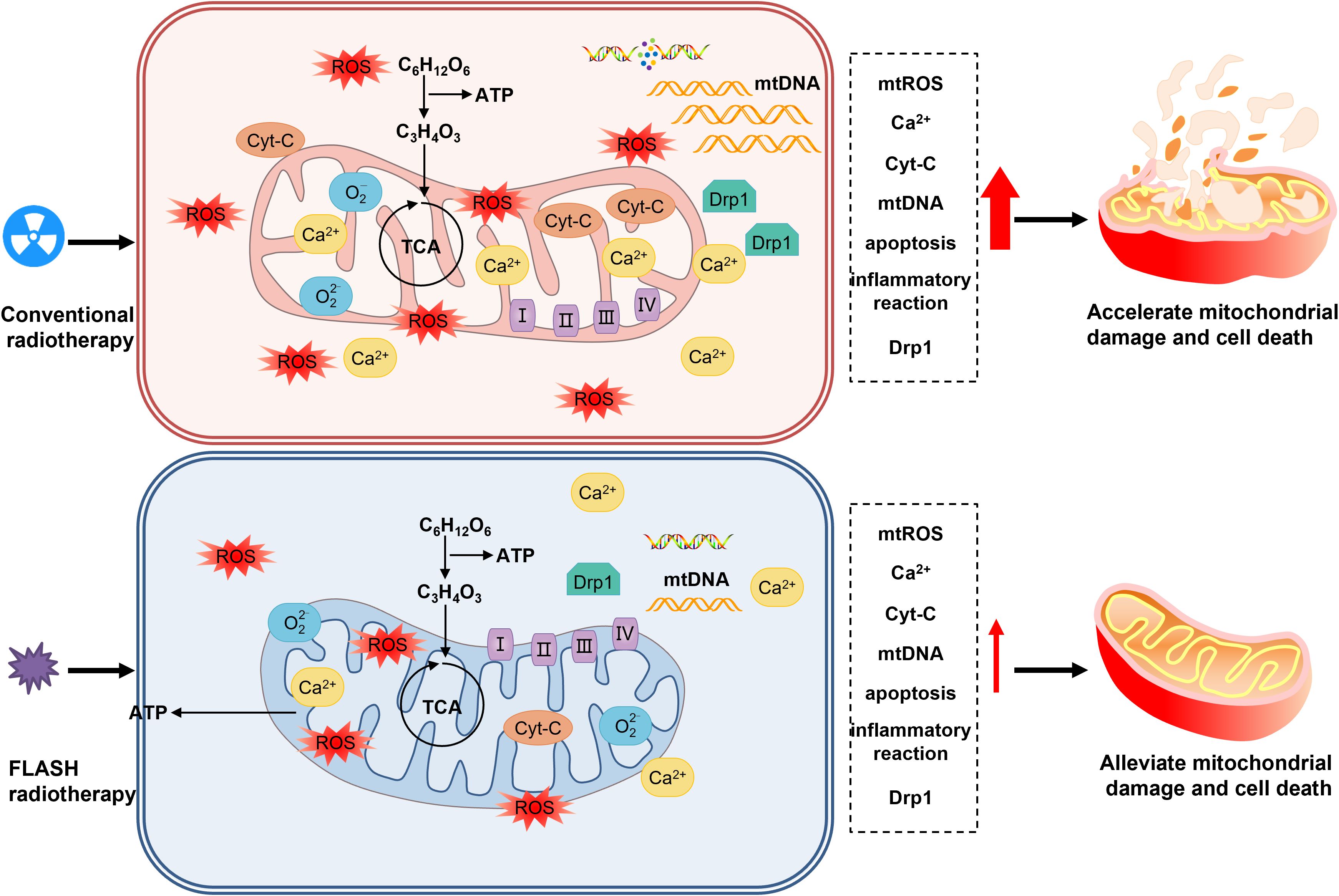 Mitochondria, as the core of cellular metabolism, generate energy through the process of oxidative phosphorylation, converting chemical energy into adenosine triphosphate (ATP). Meanwhile, they regulate cell death and signal transduction (56). Mitochondrial reactive oxygen species (mtROS) are the main source of intracellular reactive oxygen species and are involved in redox metabolism and apoptosis (57–59). Radiation can directly or indirectly damage mitochondrial DNA (mtDNA), leading to mitochondrial dysfunction and apoptosis (60–63). Compared with CONV-RT, FLASH-RT can protect the mitochondrial function of normal cells, reduce mitochondrial damage and the production of reactive oxygen species, and regulate the expression of mitochondrial-related proteins, thereby reducing the proportion of cell apoptosis and necrosis (64, 65). This protective effect may be achieved by reducing mitochondrial damage and mtROS imbalance, which helps maintain the homeostasis of normal cells. In contrast, tumor cells are more sensitive to changes in reactive oxygen species. FLASH-RT may cause the death of tumor cells by increasing mtROS, so that the tumor control effect is similar to that of CONV-RT, providing a new perspective on the mechanism of FLASH-RT (41, 48).